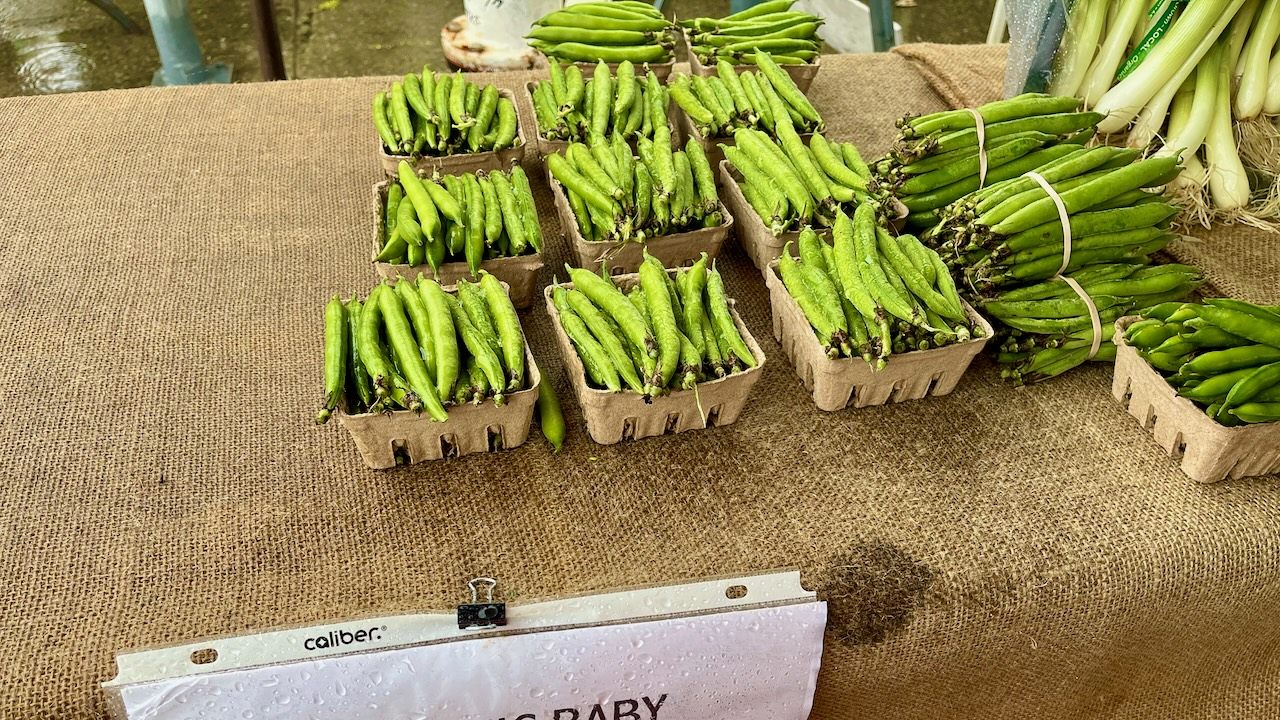 ゴールデンウィーク中の5月4日はあいにくの雨。この時期には本当に珍しく。レストラン関係やスーパーに卸している方、ビジネスされている方が目立ちました。買い物の量は半端ないのですが、そんな中で見つけたのが、小さいソラマメ(Baby Fave Beans)でした。隣で食べ方をにこやかに話していた方にもう一回教えてもらって、家で試してみるため1パック(7ドル約400g)買ってみました。