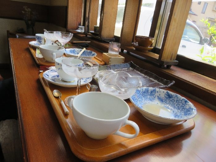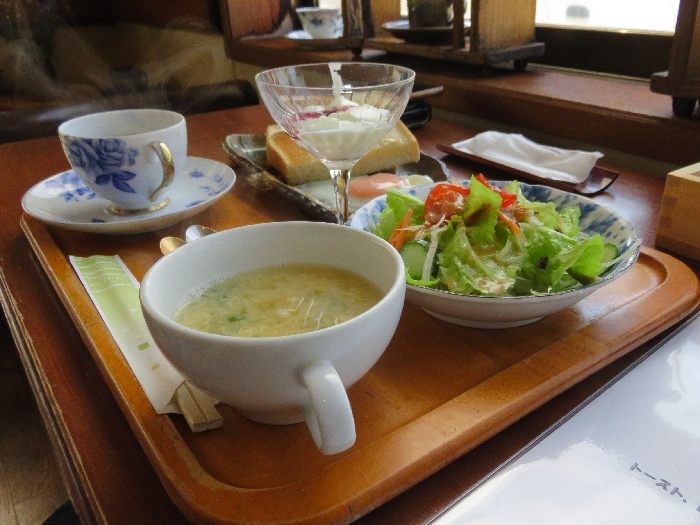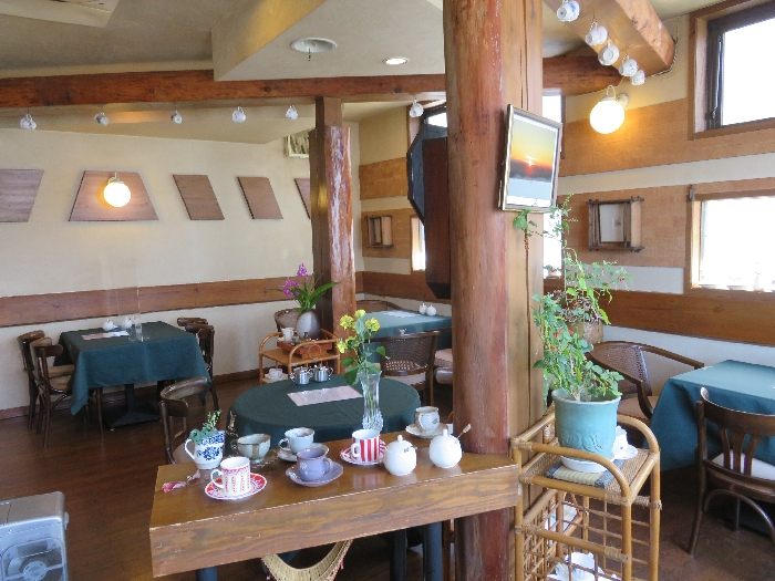 ドキドキしながら「こんにちは♪」と店内に入ると心地がいいBGMが流れてホッ♪ 「どうぞ、お好きな席へ」マスターが案内してつかったので窓際の席へ。店内、やさしい木のぬくもり感とグリーンのテーブルクロスが印象的。窓際テーブル席をはじめテーブル席がいくつかあって、各所、色げなカップソーサーが飾られとって素敵♪ 見ていてウキウキしちゃう♪