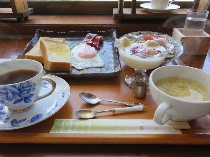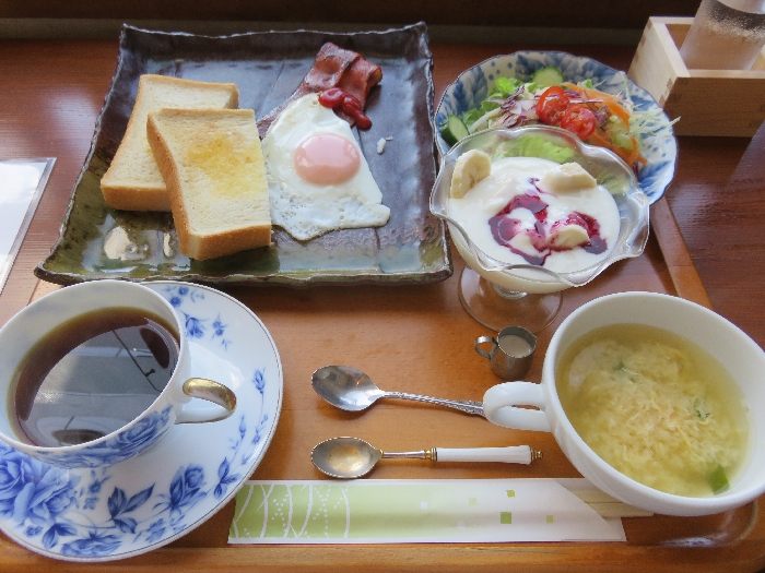 せっかくですけぇ、モーニングCセットをチョイスしましたがトースト、目玉焼き、色鮮やかなサラダ、ベーコン、バナナとベリーのヨーグルト、やさしい味わいのみそ汁、コーヒーOR紅茶と豪華!! 12:00までモーニングをやっとんさるのでブランチとしても十分な量だと思いますよ♪