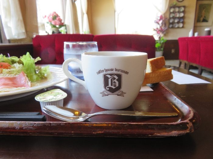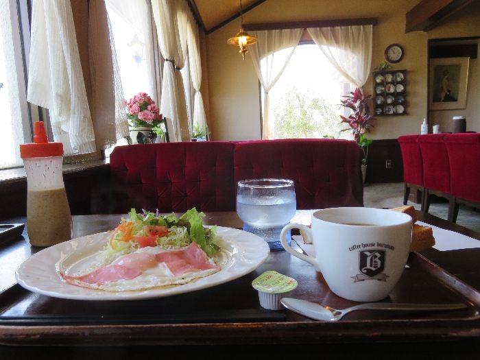 交通量の多い通りを眺めながら非現実の世界(喫茶店)の中でベルベットのソファに身をまかせながら心地のよいBGMとともにモーニングを食すのんびりとした時間、贅沢だなぁ。