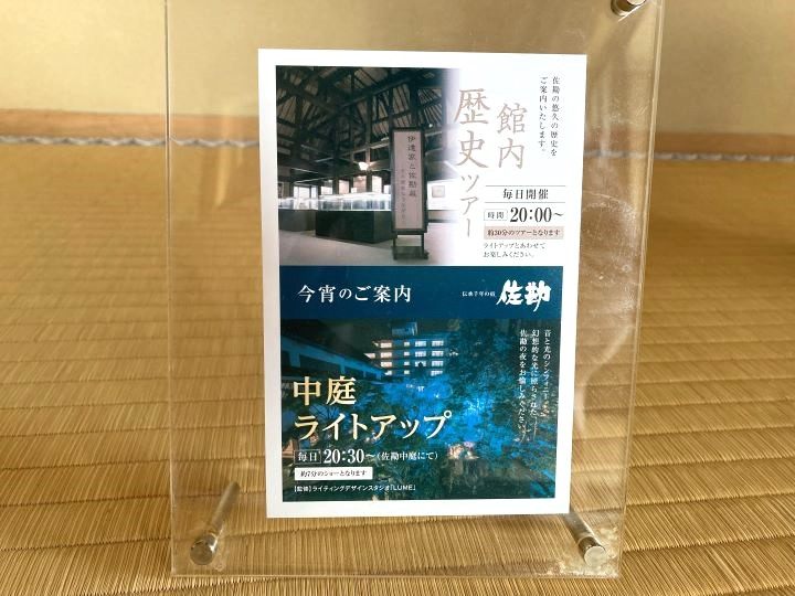 今回宿泊した日には、20時から館内歴史ツアー(約30分)、20時30分から中庭ライトアップ(約7分)が開催されていました。