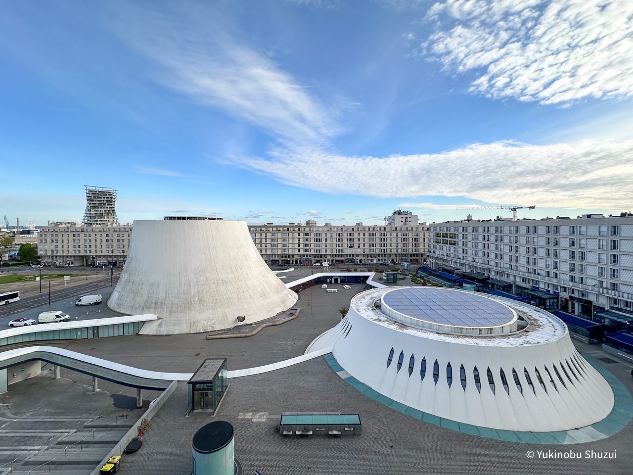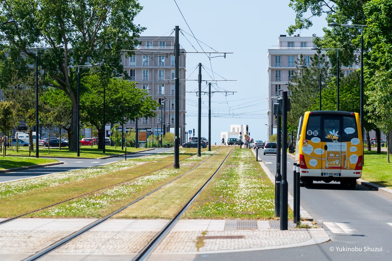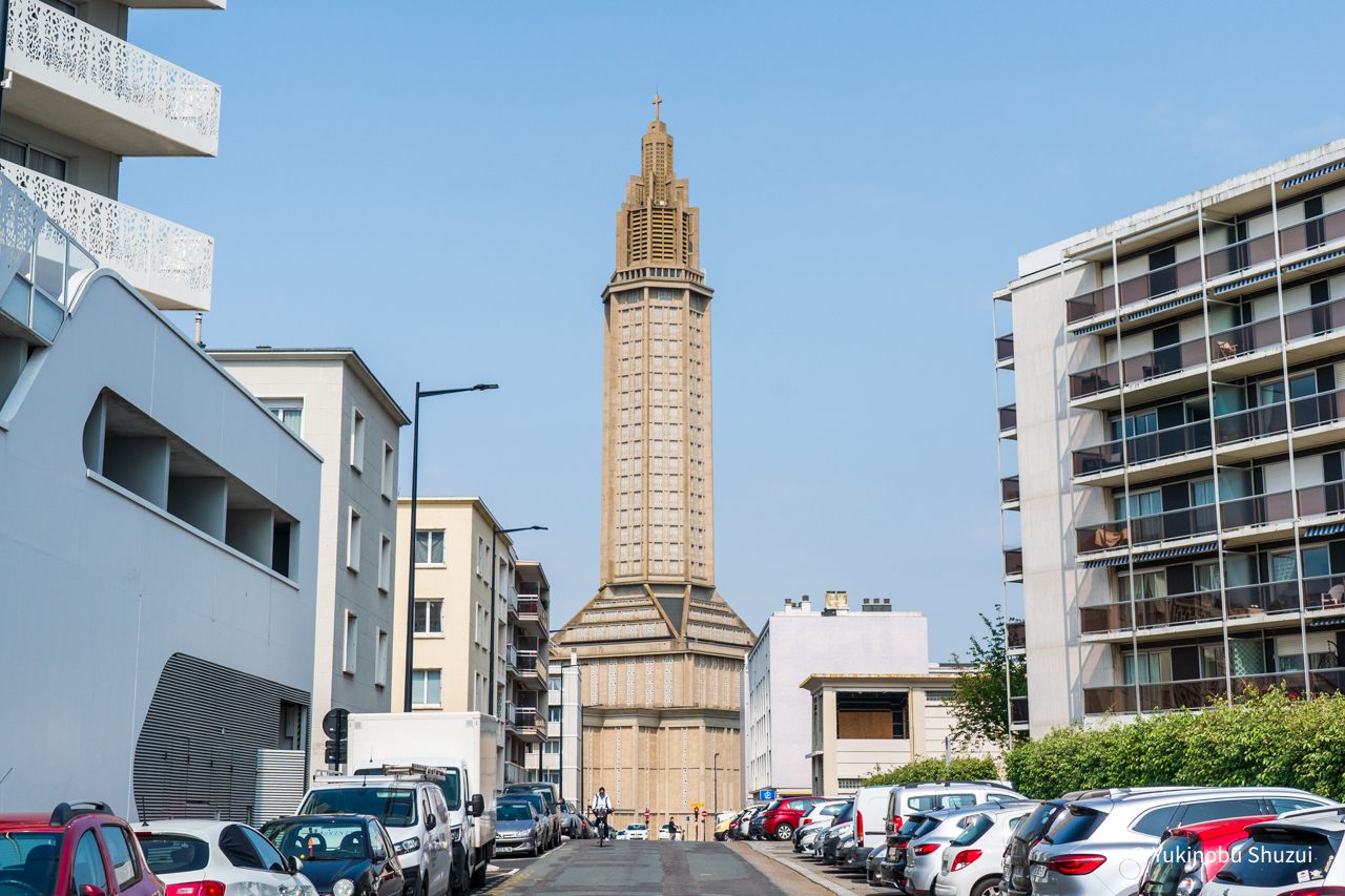 ルーアンからル・アーヴルへ来ると、町並みがガラリと変わることに驚くと思います。ル・アーヴルは第二次大戦時に広範に爆撃を受けて多くの場所で昔からの建物が失われました。その後、戦後復興において建築家オーギュスト・ペレによる都市計画が行われ、コンクリートを用いた幾何学的な構造の独特な町並みへと変貌しました。