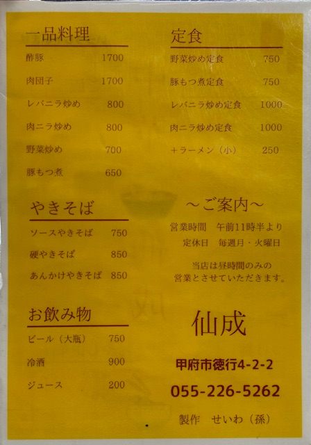 お疲れ様です。群馬特派員のKaRyoです。ちょっと前になりますが、甲府へ行った時のランチで中華食堂仙成に行って来ました。