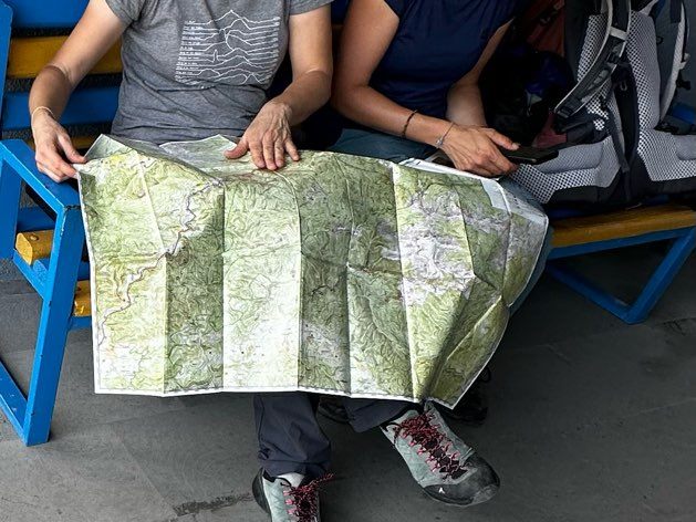 奇しくもその日の午後は停電(ジョージアではよく起こります)で、またお天気も非常に良かったので、管理局の外のベンチでゆっくりと座ってルートを決めてらっしゃいました。