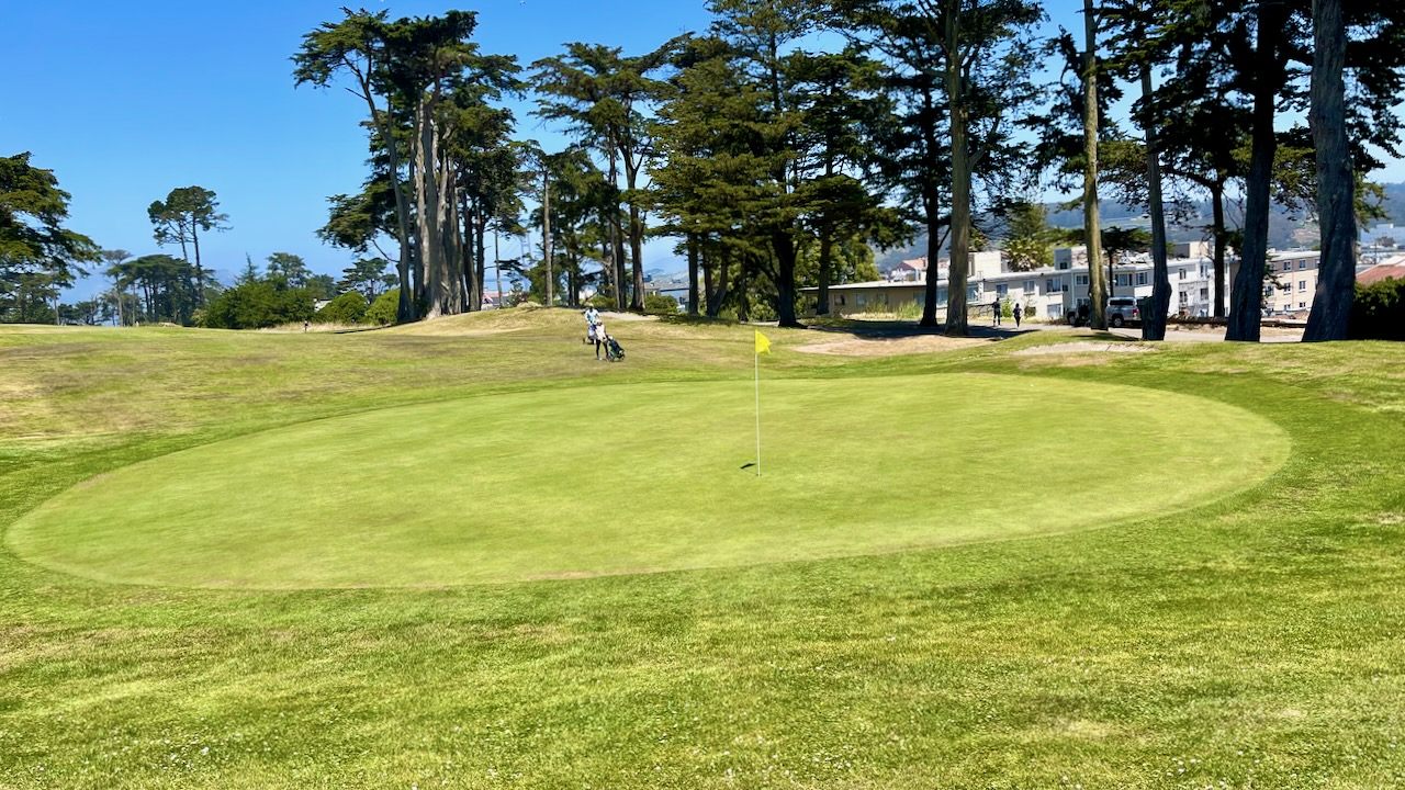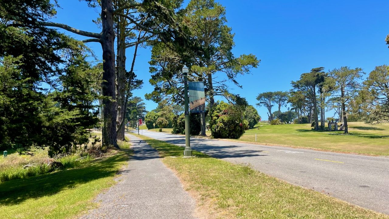その階段を登るとリンカーンパーク・ゴルフコースのホールに出ます。脇道をボールに当たらないように気をつけて道なりに歩いてください。