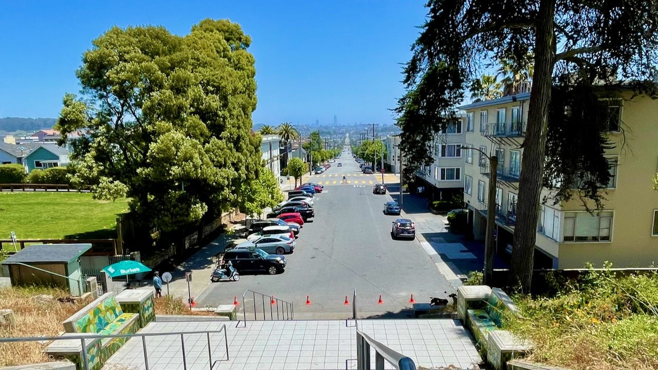 この階段は「リンカーンパークステップ」と呼ばれています。カリフォルニアStの西端にあり、1900年代初めにできました。特に補修されることもなくほったらかしにされて傷んでいたのを2007年パブリック・アート・インスタレーションとして修復を兼ねタイルアートにしようと計画を立て、市の公園局の許可を得て素敵なアート作品になりました。さびれて登れるのか? という階段が、いつの間にか美しく変わっていたのを覚えています