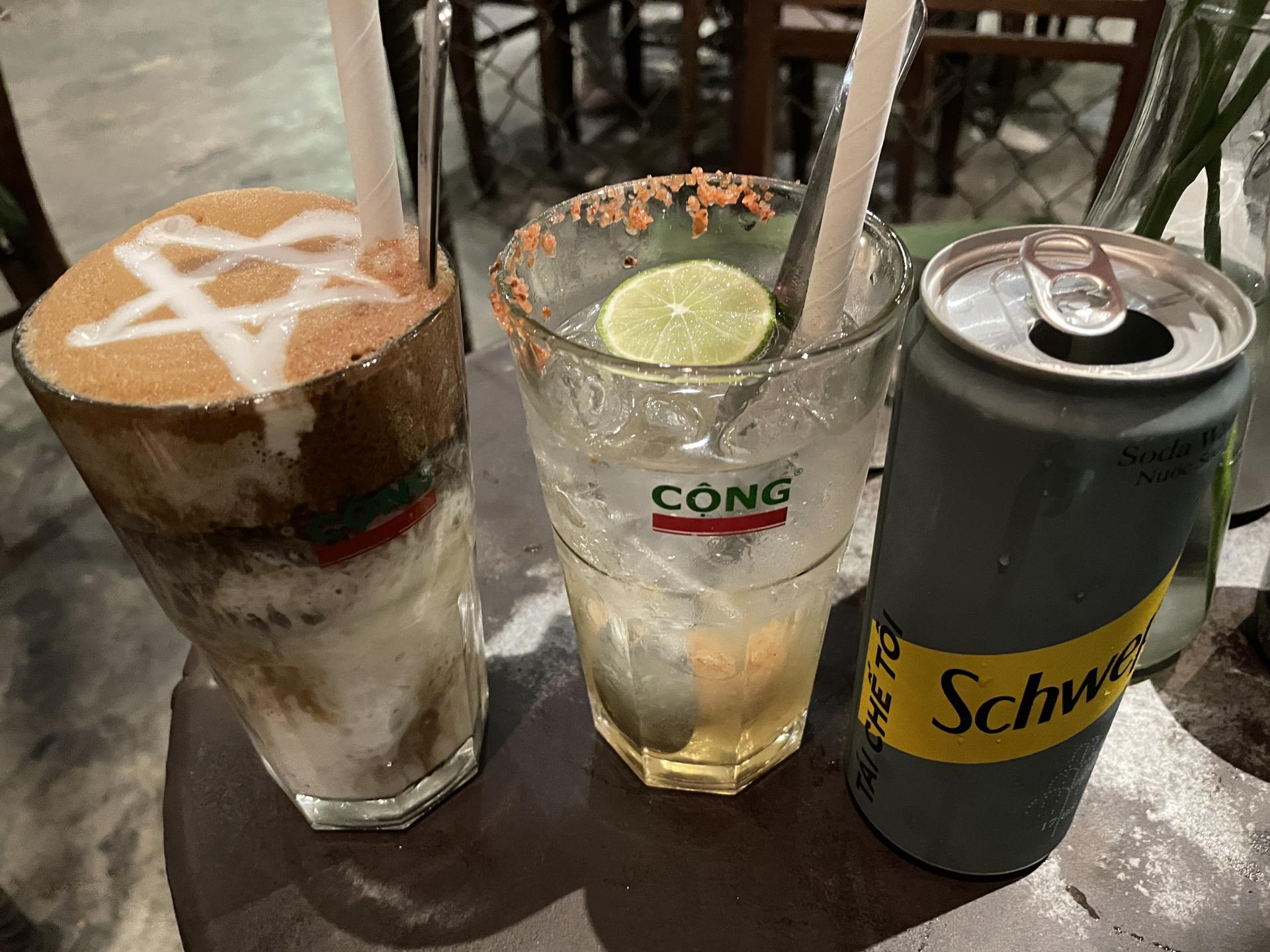 ベトナム国旗の星マークと濃厚なコーヒーにミルクが合い、とても美味しかったです。ソーダは梅入りに塩&ライム味で暑さ対策バッチリな飲み物でした。価格はホワイトコーヒー(サイズアップ)が49,000ドン、ダナンソルティッドライムソーダが55,000ドンでした。