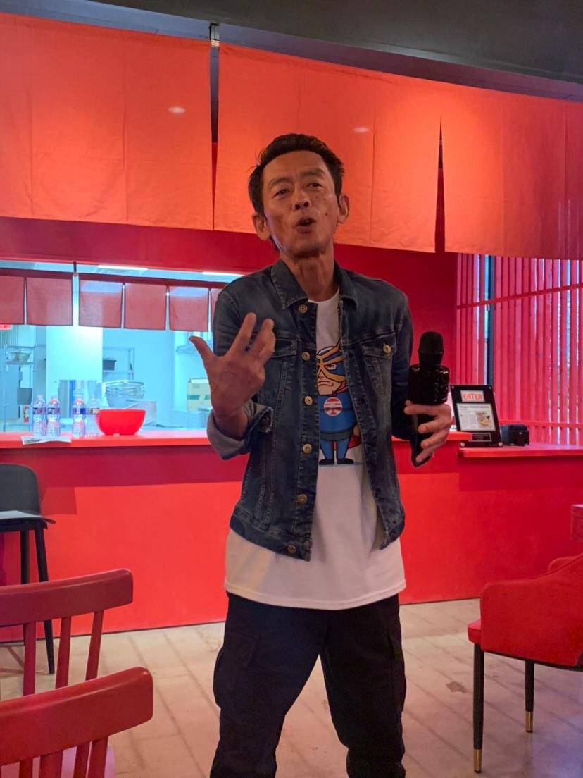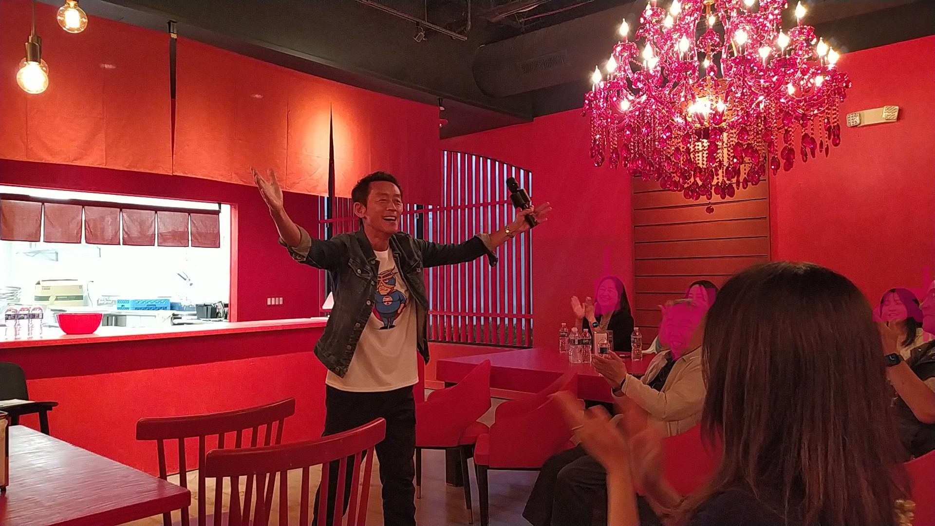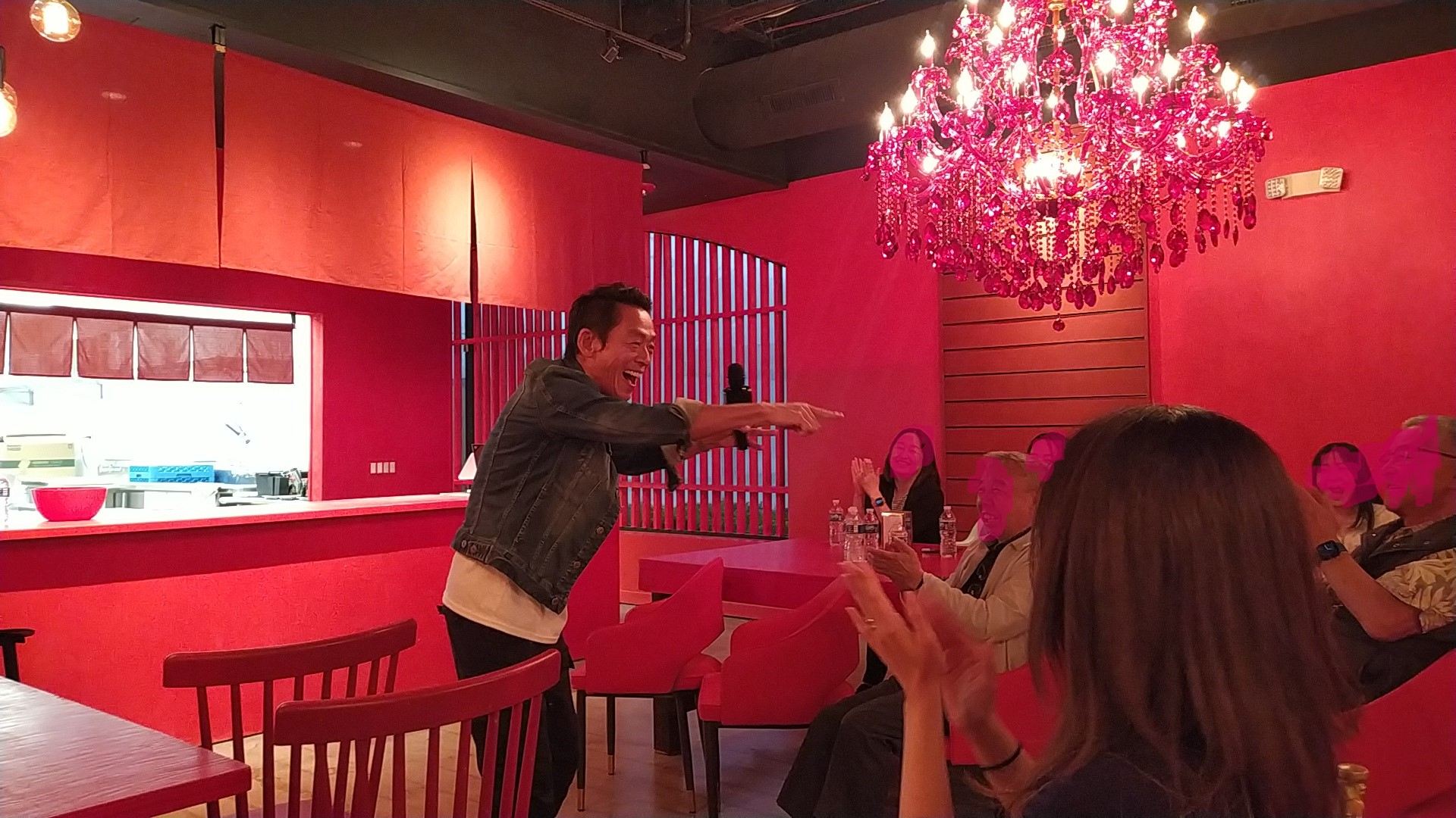 今回、シカゴでのスタンダップコメディを楽しみにしていたオーディエンスの皆さんが、続々と会場に入り、今か今かとワクワクした面持ちでぜんじろうさんを待っています。真っ赤な壁と真っ赤で大きなシャンデリアがラーメン屋ということを忘れさせる妖艶で、今から巻き起こる笑いの会場と相成りすでに大盛り上がりの雰囲気です。そこへ颯爽と登場したぜんじろうさんを大きな拍手と掛け声で、今か今かと待っていた皆さんがお出迎えです。
