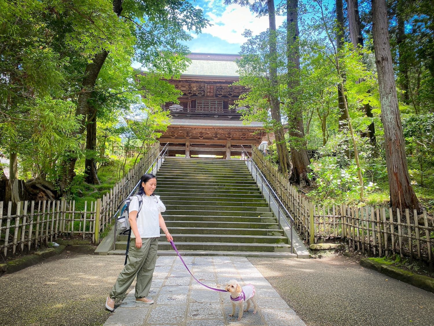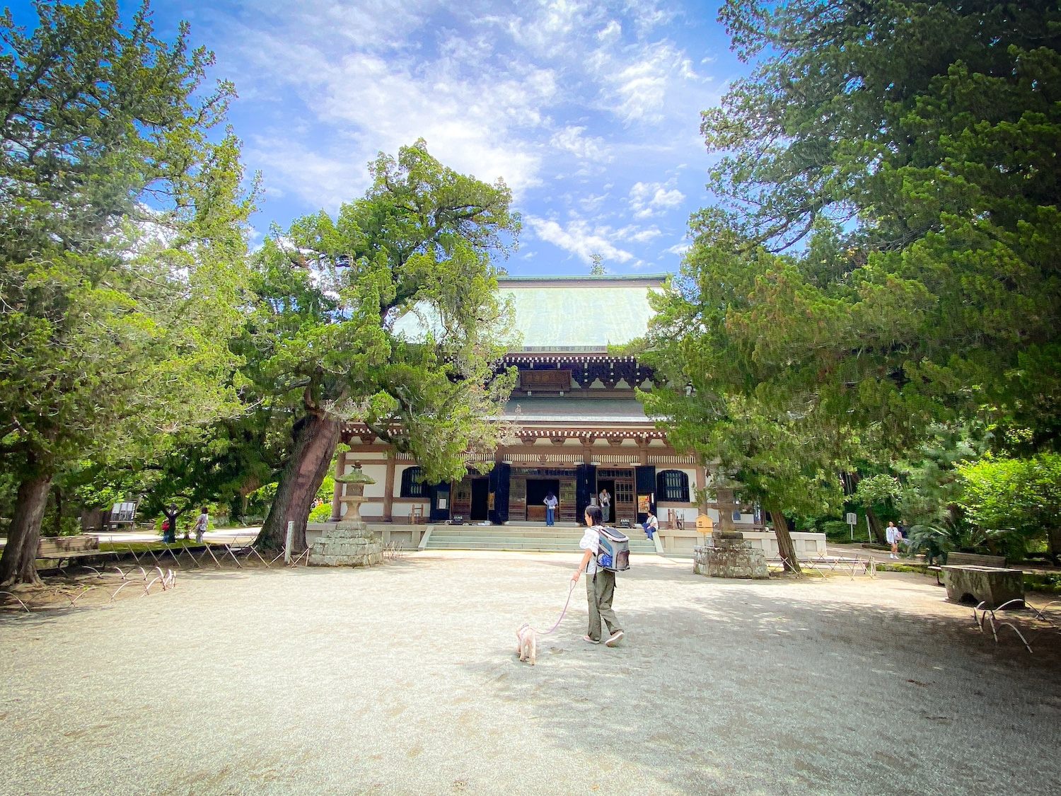 毎朝6:00からの暁天坐禅会のほか、オンラインや夜の時間帯での坐禅会、法話会、写経会などがあり、初心者からリピーターまで楽みながら仏教の世界に触れられる企画を開催しています。境内は、ワンコを連れて入ることができるので、ゆっくりお散歩を楽しむことができました。
