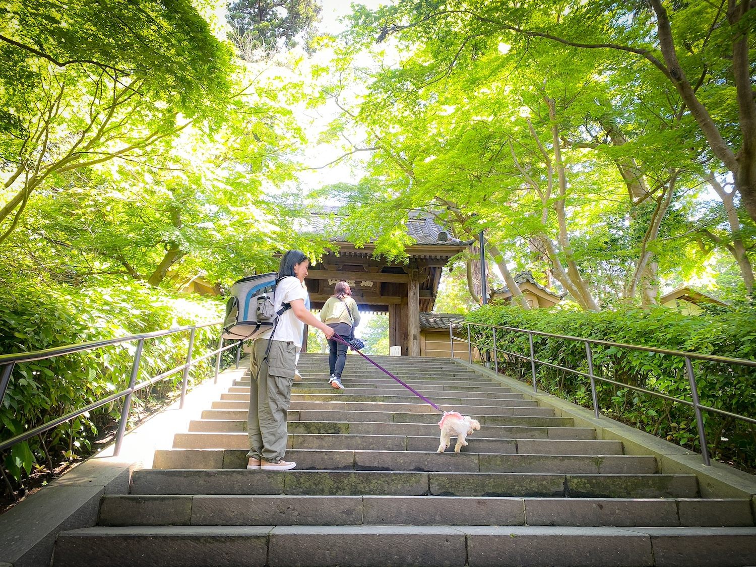 円覚寺は創建以来、いくたびかの火災に遭うなど、一時衰微したこともありましたが、江戸時代後期に伽藍を復興し宗風の刷新を図り、今日の円覚寺の基礎を築きました。現在では、北鎌倉から鎌倉駅に向かうウォーキングコースで立ち寄る人も多い人気スポットとなっています。秋の紅葉も有名ですが、新緑の季節の青々としたもみじも見応え抜群。天気のいい日は、ワンコのお散歩にもってこいです。