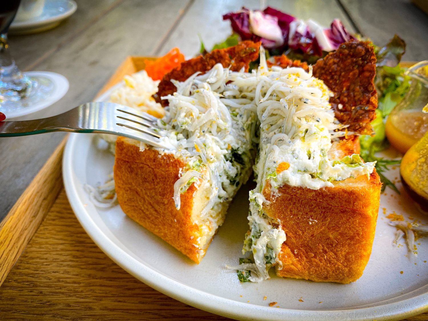 今回、注文したのは、同店舗限定メニューの「ムーしらす プレート」。看板食パン「ムー」を使用したオープンサンドに、たっぷりの「しらす」をプラスしています。「これでもか!」というくらいの「しらす」の量に、思わず驚いてしまいました。