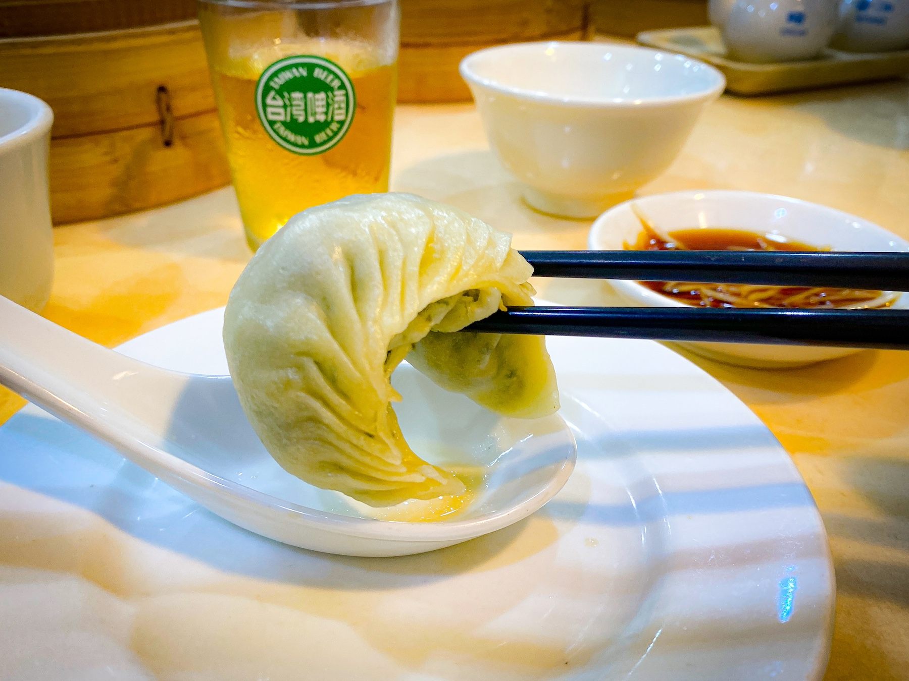 ワクワクしながらメニュー表を開くと、小籠包や蒸し餃子がズラリ。どれもおいしそう迷ってしまいます。そんななか、まず注文したのは乾杯の「台湾ビール18DAYS」。やっぱり乾杯と言えばコレ! 写真のグラスは「台湾啤酒」ですが、中身は賞味期限が18日だけの奇跡のビール「台湾ビール18DAYS」です。加熱処理をしていない生ビールのため、現地でしか楽しめない”とっておき”の1杯。苦味や酸味など雑味がほとんどなく、ほんのりとした甘味が広がり、穀物の香りがふわりと立ち上がります。小籠包とも相性抜群で、グイグイ進んでしまいます。