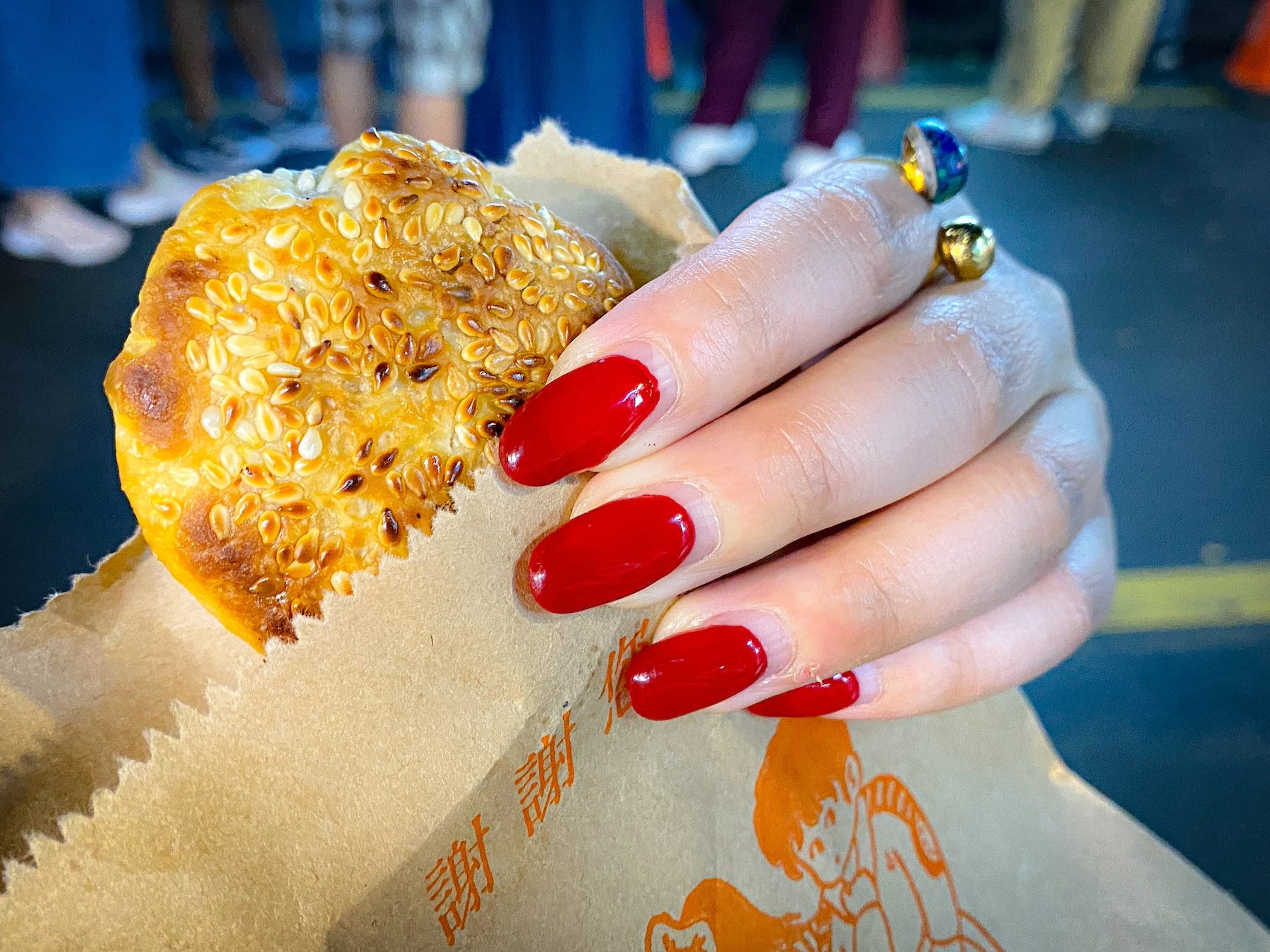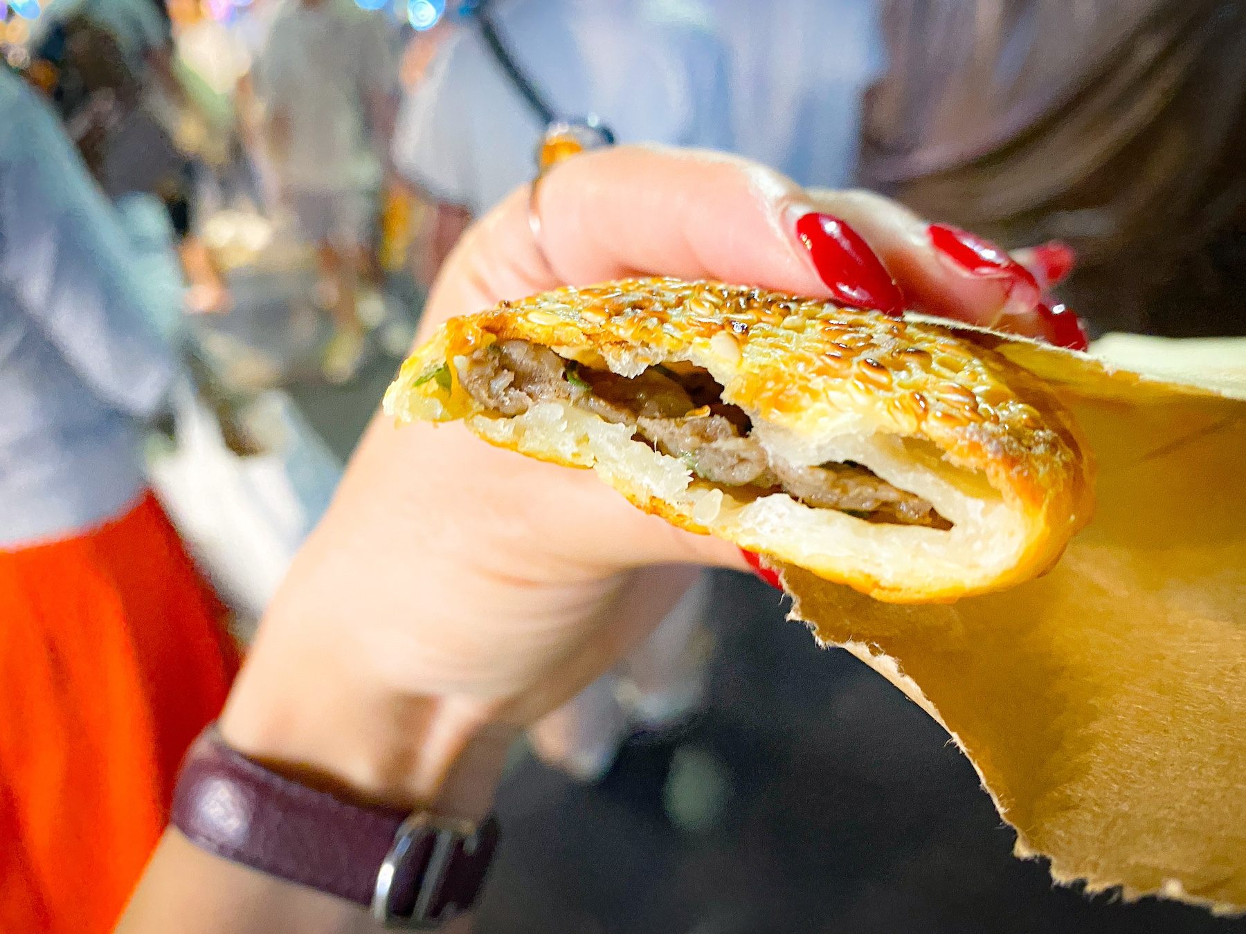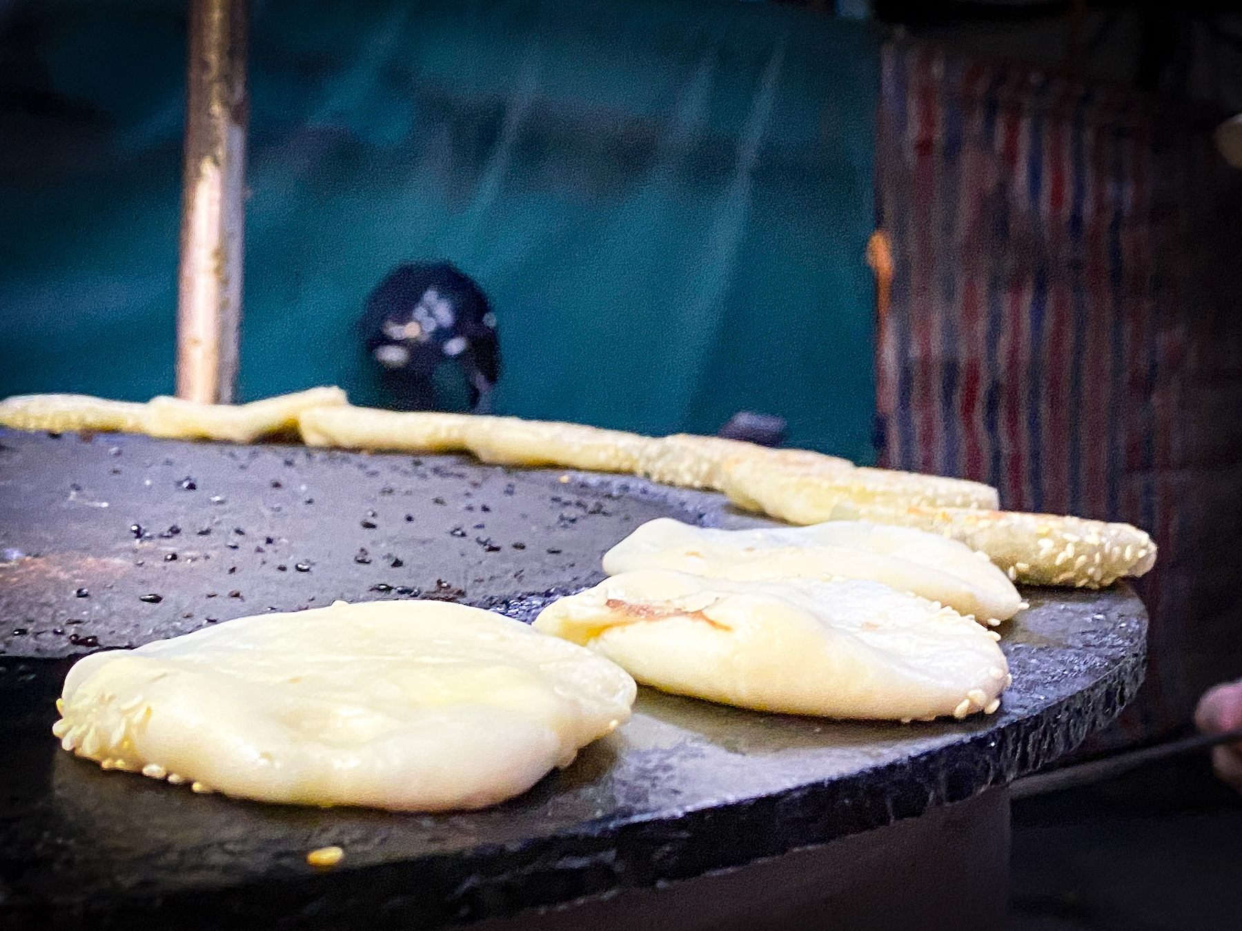 店名は「無名推車焼餅」。日本語で、「名もなきリヤカー焼パン屋台」という意味なんだとか。あんを詰めてからその場で、どんどん焼き上げていくのですが、ノンストップで焼き上げる様子は職人技。メニューは、長焼餅(葱入り)、鹹酥餅(豚肉入り)、紅豆餅(小豆入り)、甜酥餅(砂糖蜜入り)の4種類。各15元というローカル価格で楽しめます。