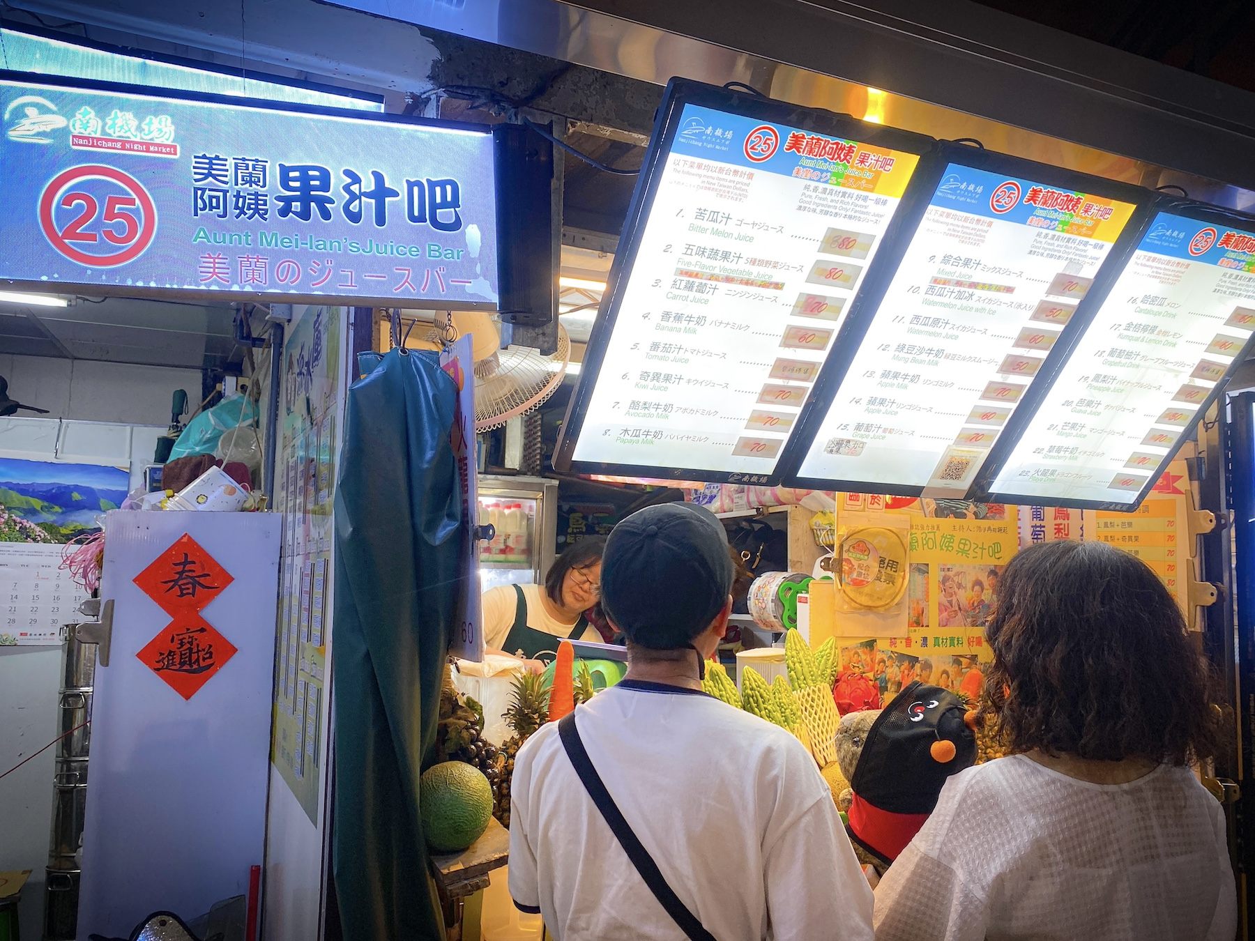 食べ歩いていたらのどが渇いてきたので、入口付近のジューススタンド「美蘭阿姨果汁吧」へ向かいました。こちらは南機場でも名物的存在のお店。店頭に積み上げられた色鮮やかな果物が目印です。メニュー表はカタカナ表記があるので、注文するのも安心。