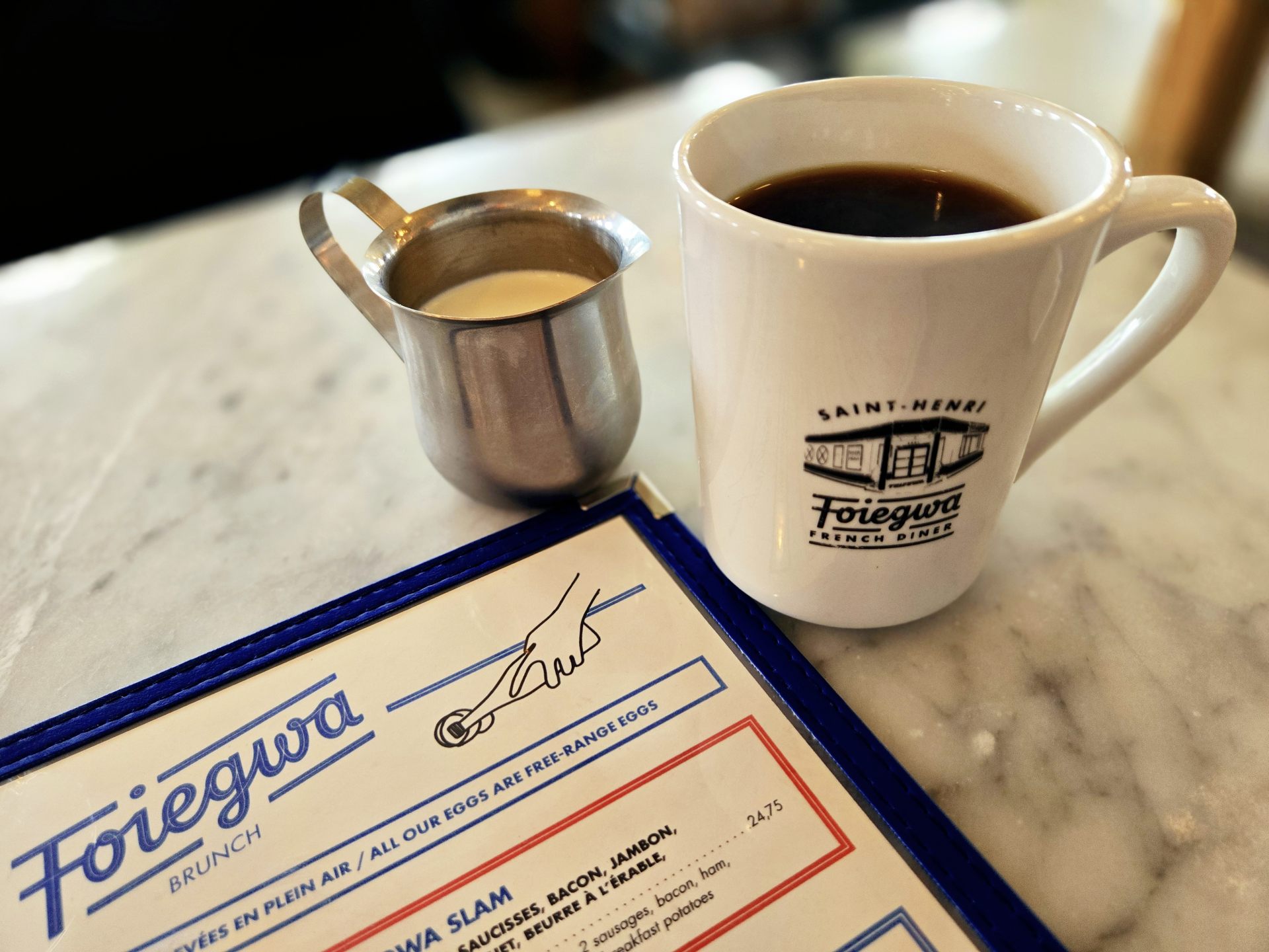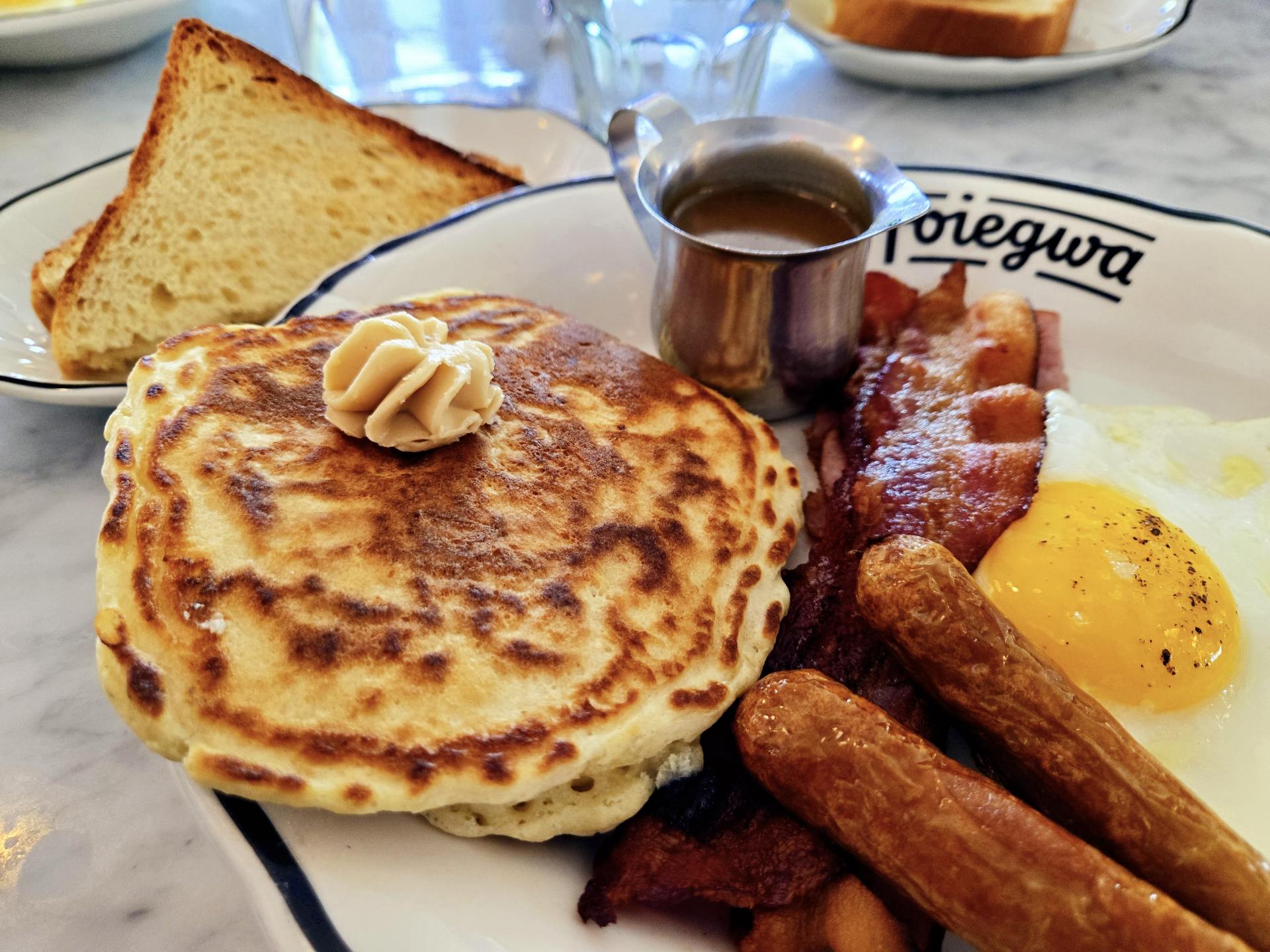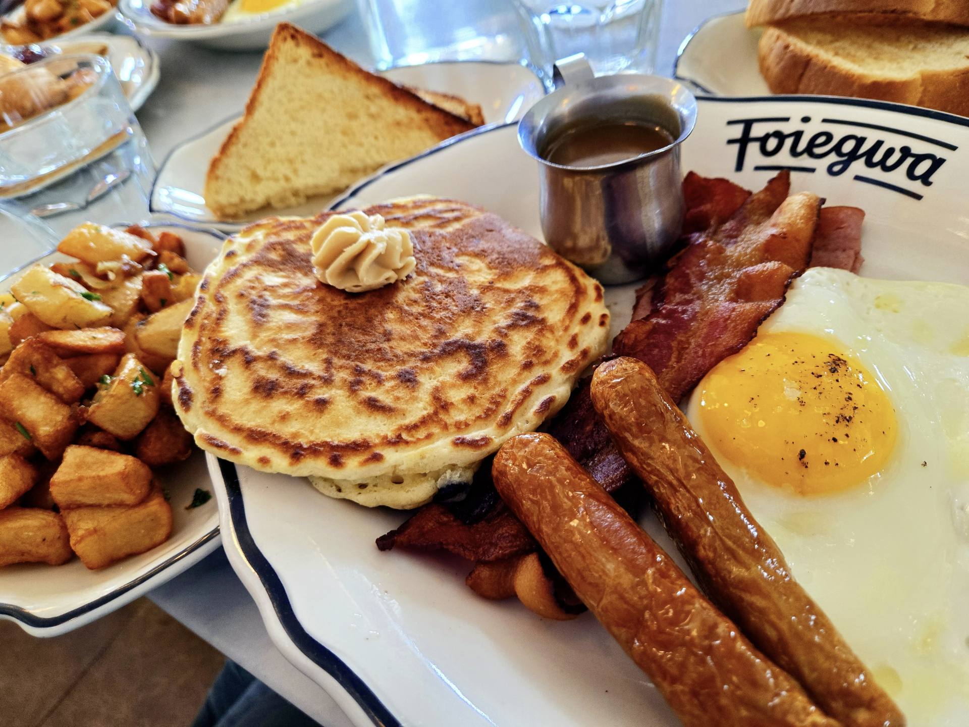 おススメのメニューは「Le foiegwa Slam」で、目玉焼き2つ、ハム、ベーコン、ソーセージ、ポテトといった典型的なブランチメニューに加え、ブルーベリーとリコッタチーズの入ったふわふわのパンケーキがついてきます。