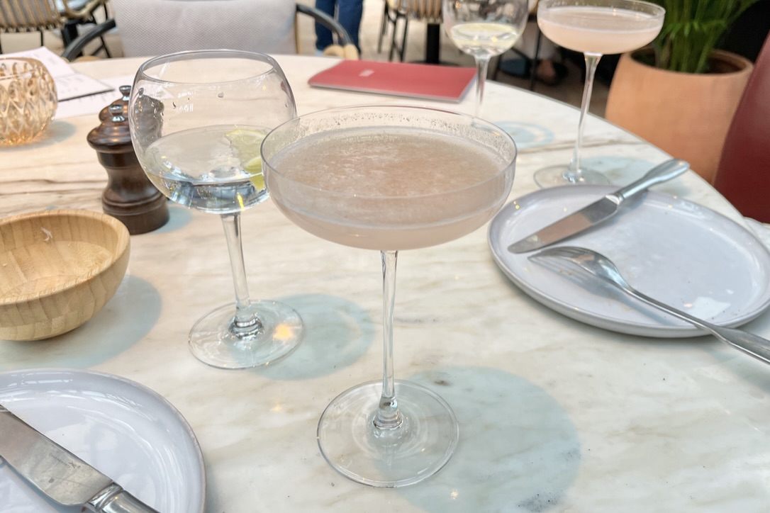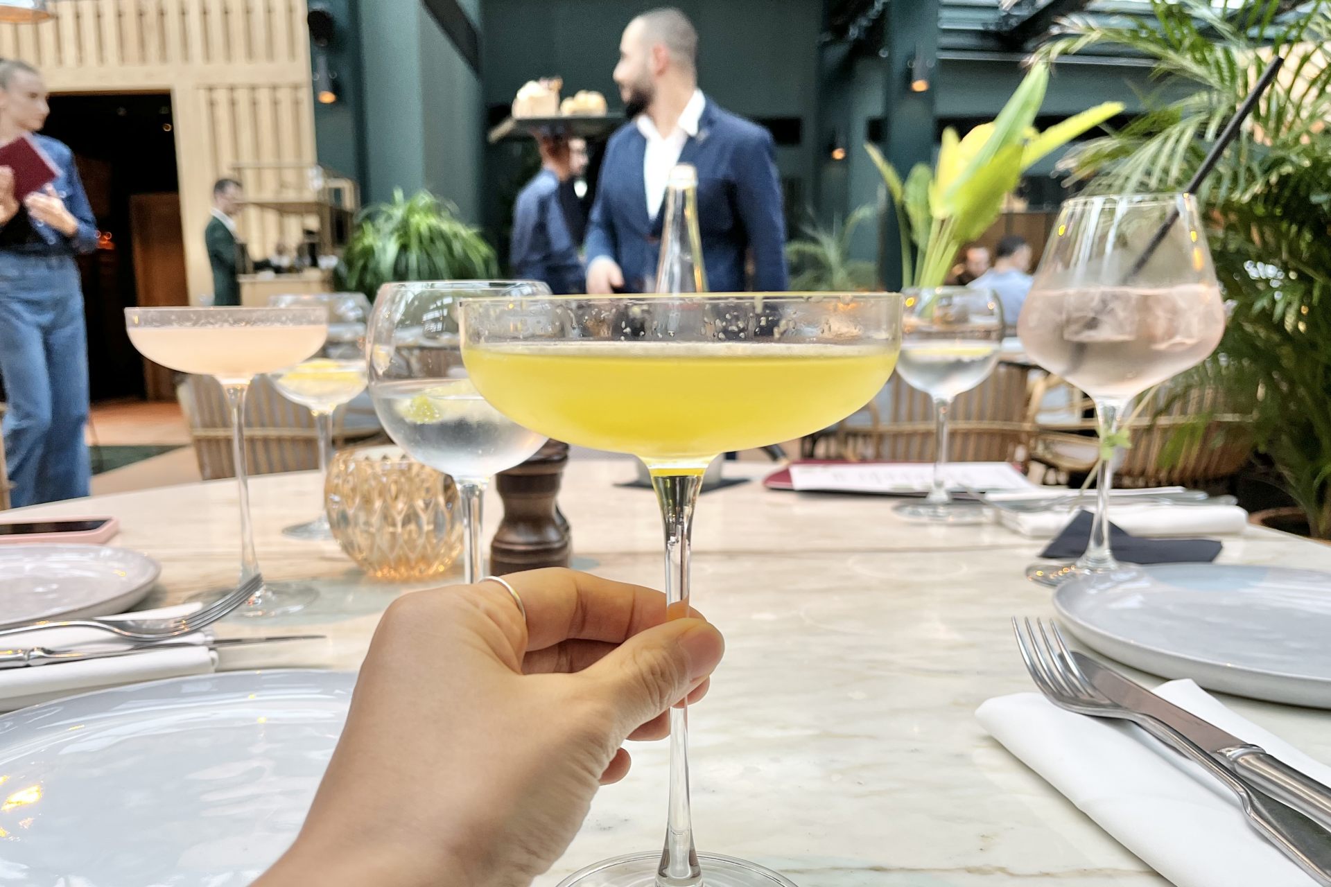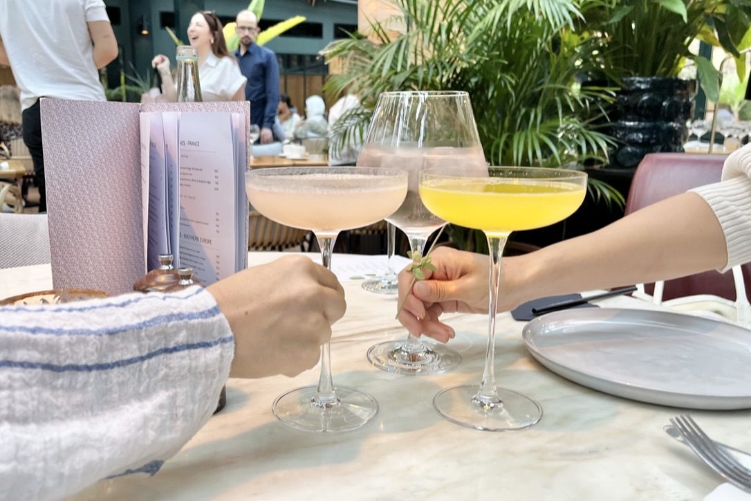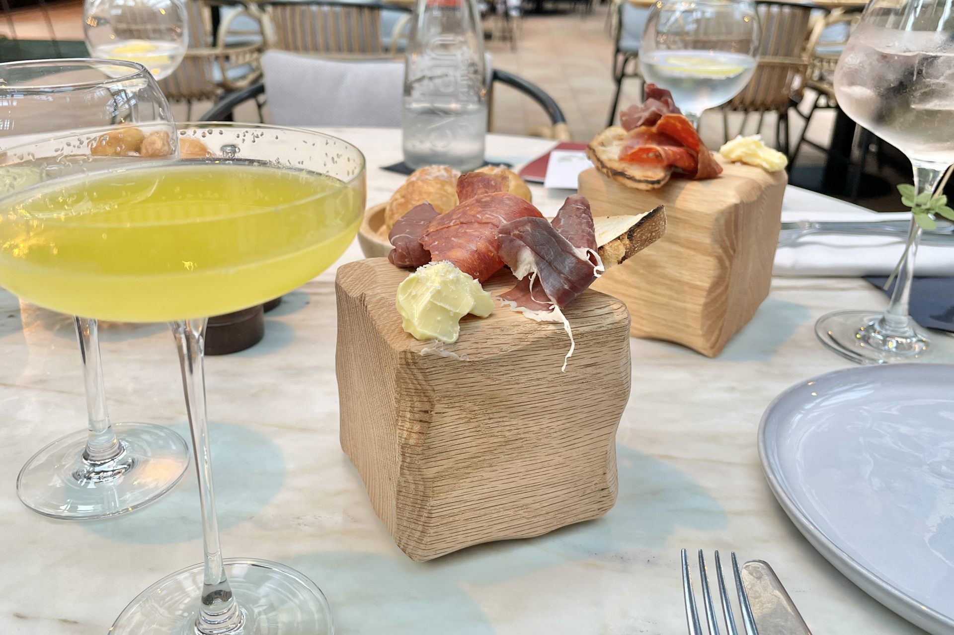 「ユージーン・ユージン」では午後のひと時を盛り上げるためのドリンクプランが用意されています。毎日夕方16時〜19時まで提供される「アペリティフ ユージン(L'Apéritif d’Eugène)」では、アルコールを含むカクテル2杯とシェフ厳選の前菜がセットで110AED。ドリンクは、エルダーフラワーやフレッシュピーチ、アペロールなどをプロセッコで割ったカクテル4種と、スイカやバジル、レモン、ミントなどを使用したモクテル3種から選べます。