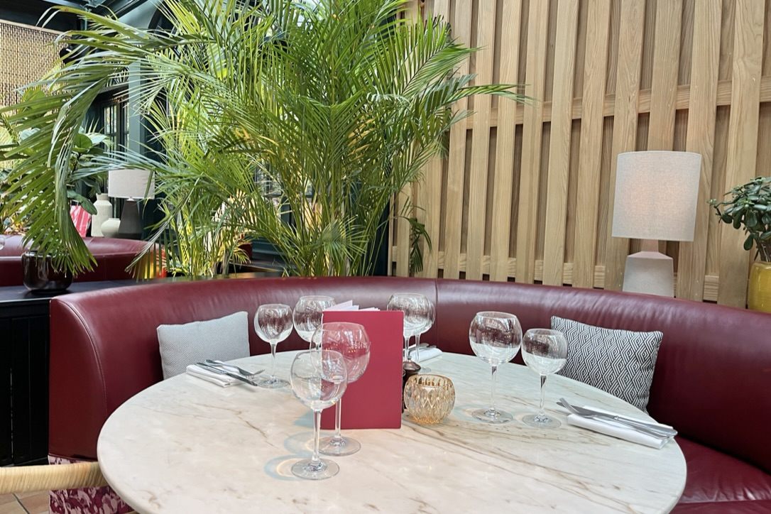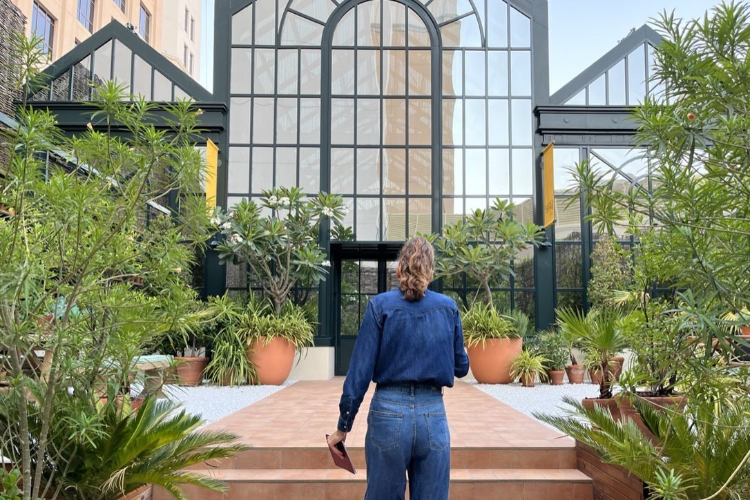 「ユージーン・ユージーン(Eugène Eugène)」はモールオブエミレーツ(MOE)直結の「ケンピンスキーホテル」内にあるフレンチレストラン&バー。受付を済ませると、スタッフが中庭を通ってレストランへと案内があり、一歩外に出るとそこはまるで植物園のような別世界が広がっています。お庭では青空の下でさまざまな種類の植物が出迎えてくれ、重厚感のあるヨーロッパのグリーンハウスのような外観のレストランへと続いています。
