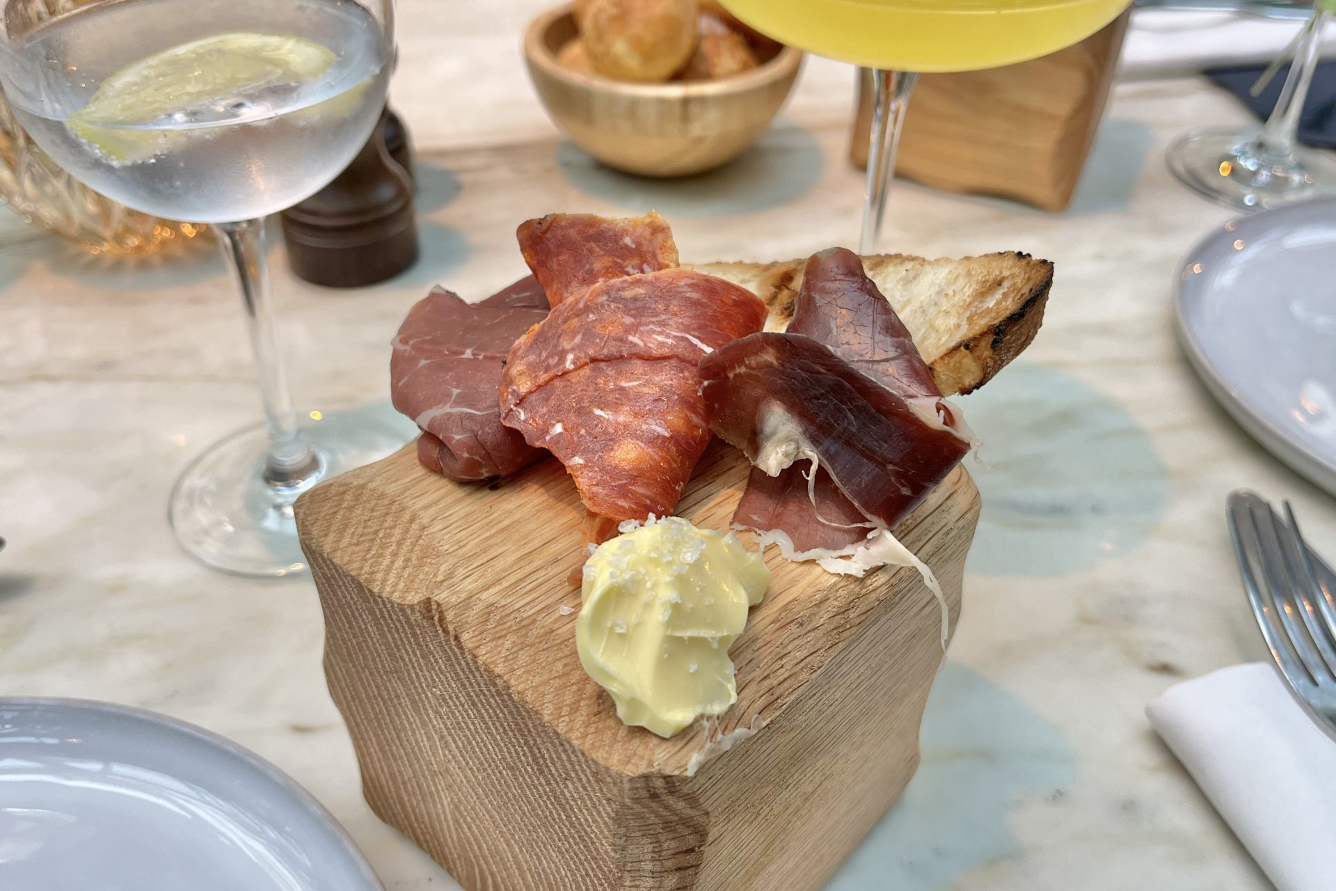前菜はおまかせで、ビーフの生ハム盛り合わせと、「グジェール」というシュー生地にチーズを練り込んだフランス・ブルゴーニュ地方の郷土料理がアペロのおつまみとして提供されます。