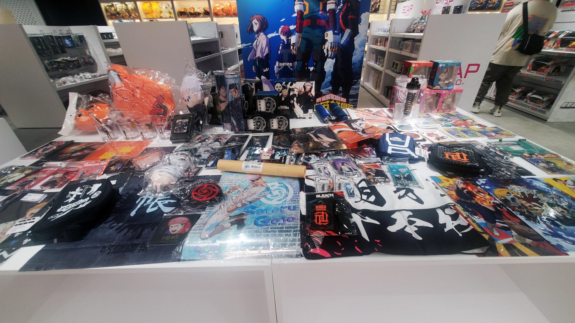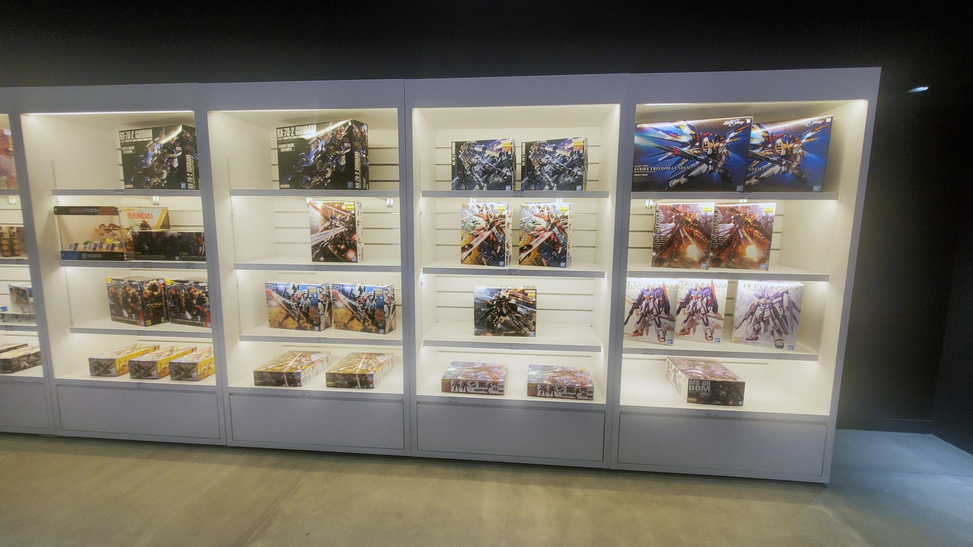 入口の左にピンクの長い廊下があり、そこには「ポケモン」のレアカードなどが展示されています。右側は巨大なキャラクターグッズの販売エリアで、店全体で4000アイテムあります。ガンダム、ドラゴンボール、ちびまる子ちゃん、進撃の巨人などの各種キャラクターグッズがたくさん売られています。いちばん奥にはプレイステーションなどのゲームも販売されているほか、プレステを含む任天堂のSwitchやXboxの最新ゲームを体験できるスペースも用意されています。