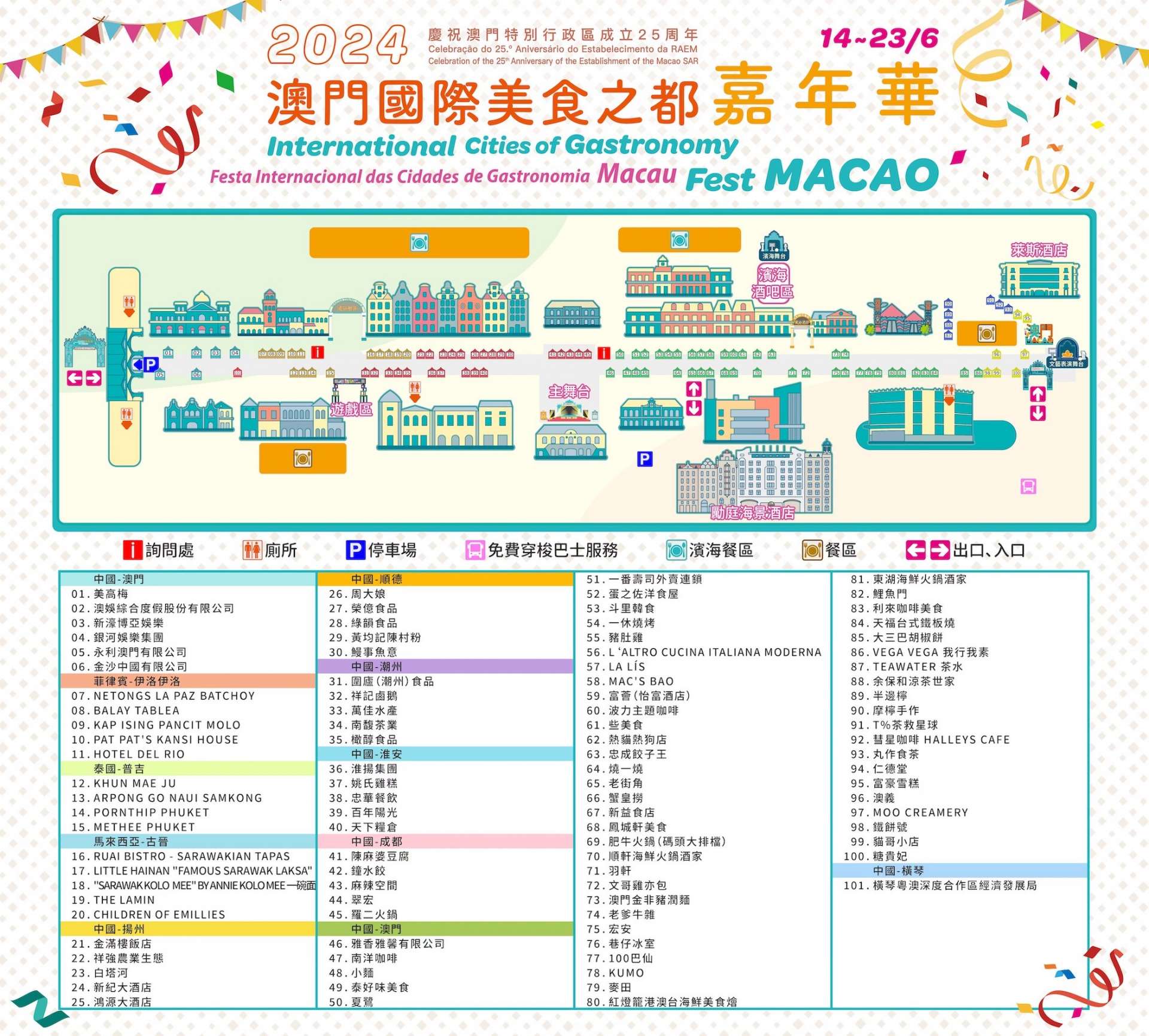 中国とアジアの各美食都市から約100の屋台がそれぞれの特色のある料理を提供いたします。またダイニングエリア・ゲームエリア・マリーナバーエリア等それぞれでスケジュールされた各種パフォーマンスもあり、「美食創造都市」の魅力を存分に引き立てる、ユニークで大規模な文化的な美食イベントがこのマカオ国際美食フェスティバルです。