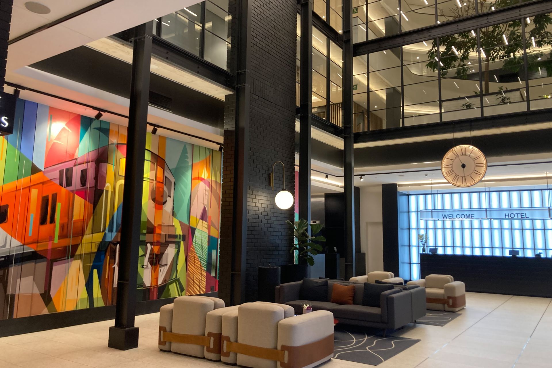 ホテルの1階にサーモンピンクのおしゃれなカフェが併設していて、