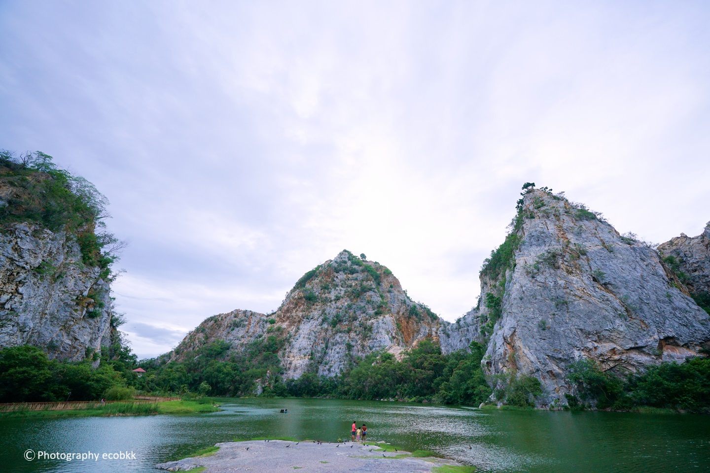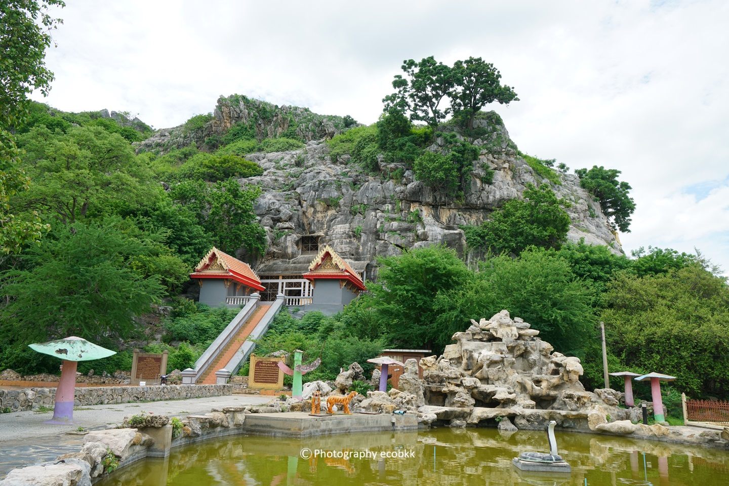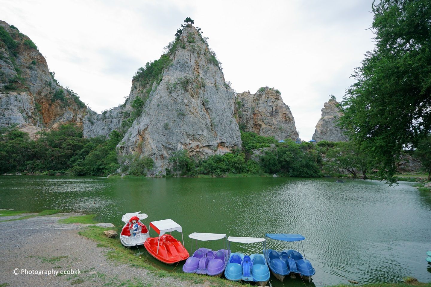スネークパークという名称で紹介されることもあるため、怖いイメージを抱くかもしれませんが、岩山とグリーン色の水辺がとてもきれいだと感じるスポットで、家族らともまた訪問したいと思う場所でした。橋を渡って、遊歩道を奥のほうまで散策することもでき、天候にもよるかもしれませんが、気持ちのよいお散歩ルートでした。水辺ではお魚の餌やりやボート乗り等も楽しむことができ、ヒンカオグー公園敷地内ではいちばんにぎわっているエリアでした。このエリア近くには、お猿さんに食事をあげることを禁止するタイ語の標識がありました。