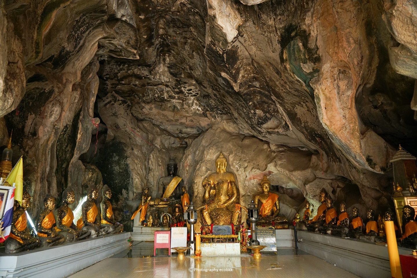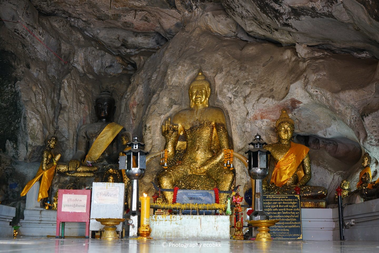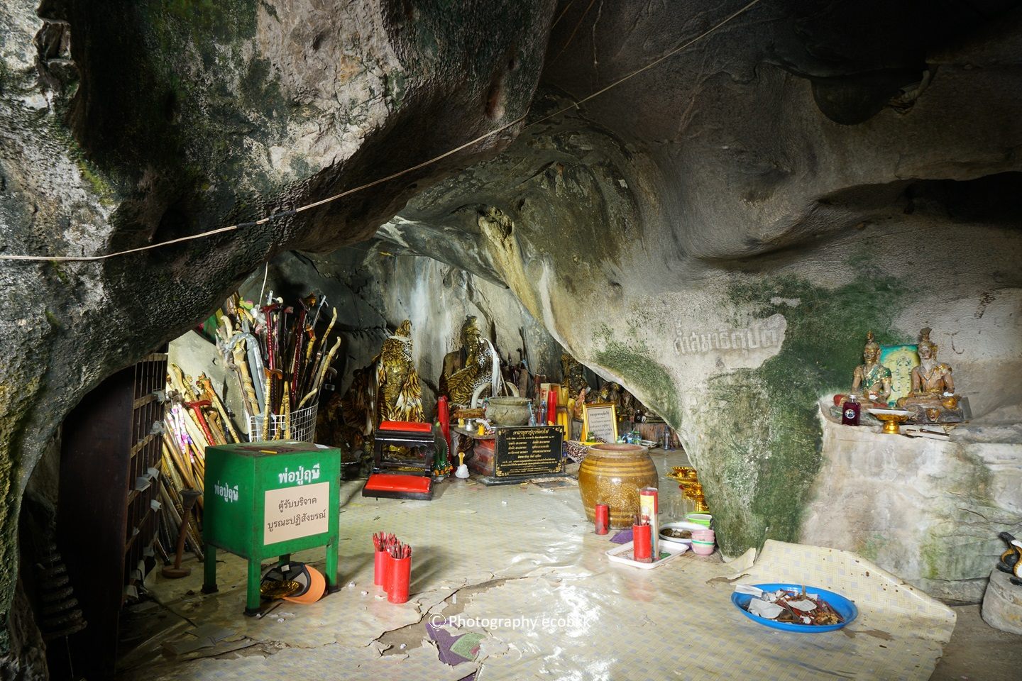 現地の入口には、タム・ルーシー・カオグー(Tham Ruesi Kaogu、ถ้ำฤาษีเขางู)という標識があり、プラプッタチャーイ(พระพุทธฉา)という仏像が安置されている洞窟ということでした。タムルーシーカオグーの「タム」は「洞窟」、「カオグー」は「蛇山」という意味です。入ってすぐ左手の奥と、入って奥の仏像の左手にも仏像が安置されていました。
