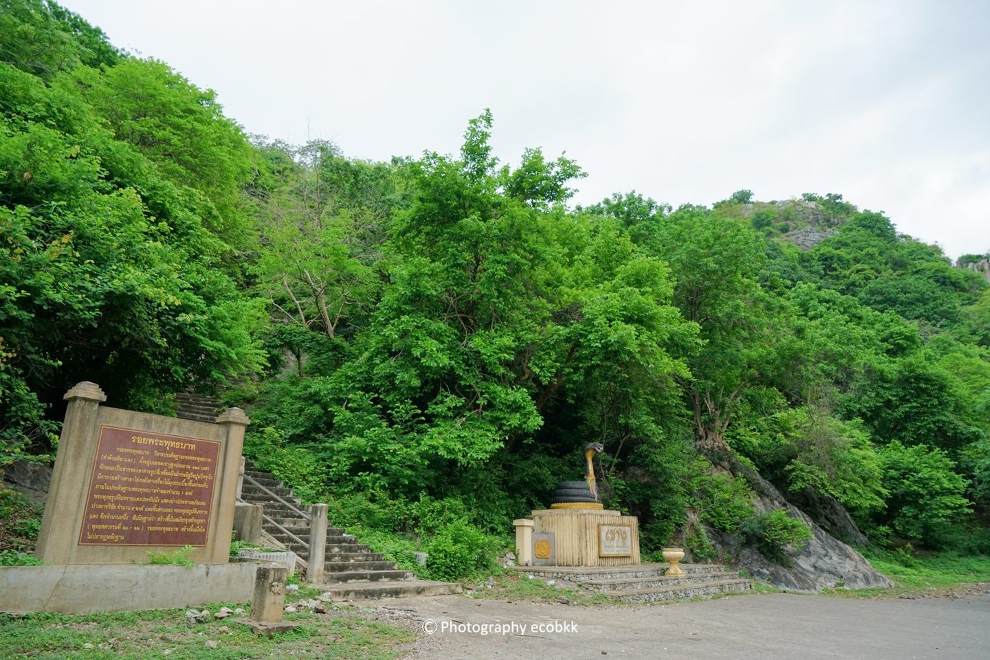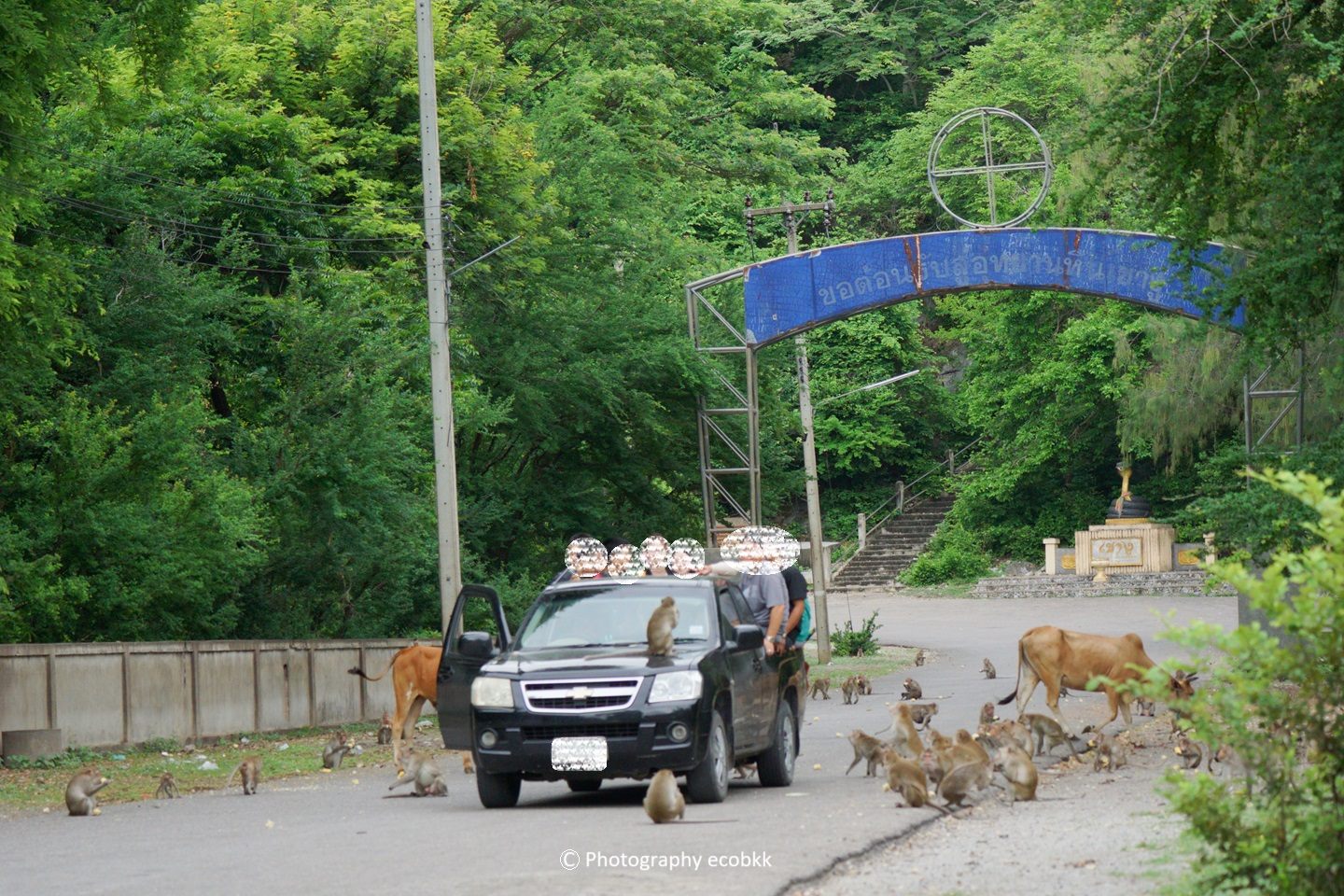 遊行仏を観賞した後、Google mapでพระพุทธฉาย ถ้ำฤาษีเขางู(読み方:プラプッタチャーイ・タム・ルーシー・カオ グー)として登録されている所へ向かいました。開館時間が9時~16時で、初日訪問時はすでに閉館していたので、2日目に訪問しましたが、近くでお猿さんにトウモロコシをあげていたタイ人女性から、きれいなので、見たほうがいいとアドバイスをもらった洞窟です。入口周辺には、10頭程度のお猿さんがいましたが、観光客には何の関心もなさそうでした。