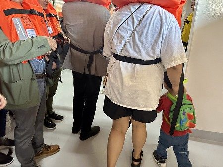 全長290mもある船、ほぼ船尾の私達の部屋は、ライフジャケットを取りに行くのにも遠距離、そのまま行きかけたら、クルーに部屋番号を聞かれ、取りに行くようにと。