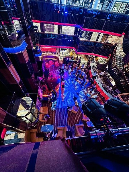 吹き抜けから見たところ。音楽に合わせてダンスをしたり、うしろのバーでは思いおもいにドリンクを飲んで過ごしています。どこでも楽しめるコスタセレーナの旅。