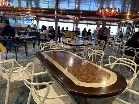 メインダイニングでのフルコースディナーです。かなり広い会場ですが、開始時間はふたつに分かれており、コスタカードに記載の指定の時間に行きます。