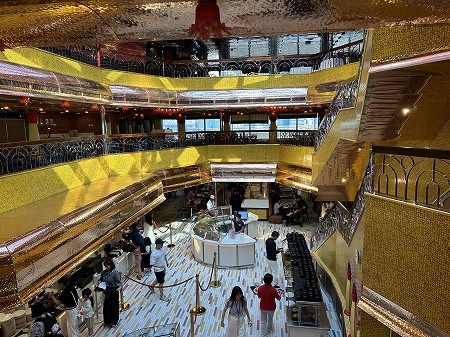 約1300席、3階層にわたるシアターです。暗くて見えにくいですが、天井には、古代ローマの将軍の凱旋パレードをモチーフにした装飾が施されています。アクロバットショーやミュージカルなど豪華絢爛なエンターテイメントショーは必見です。