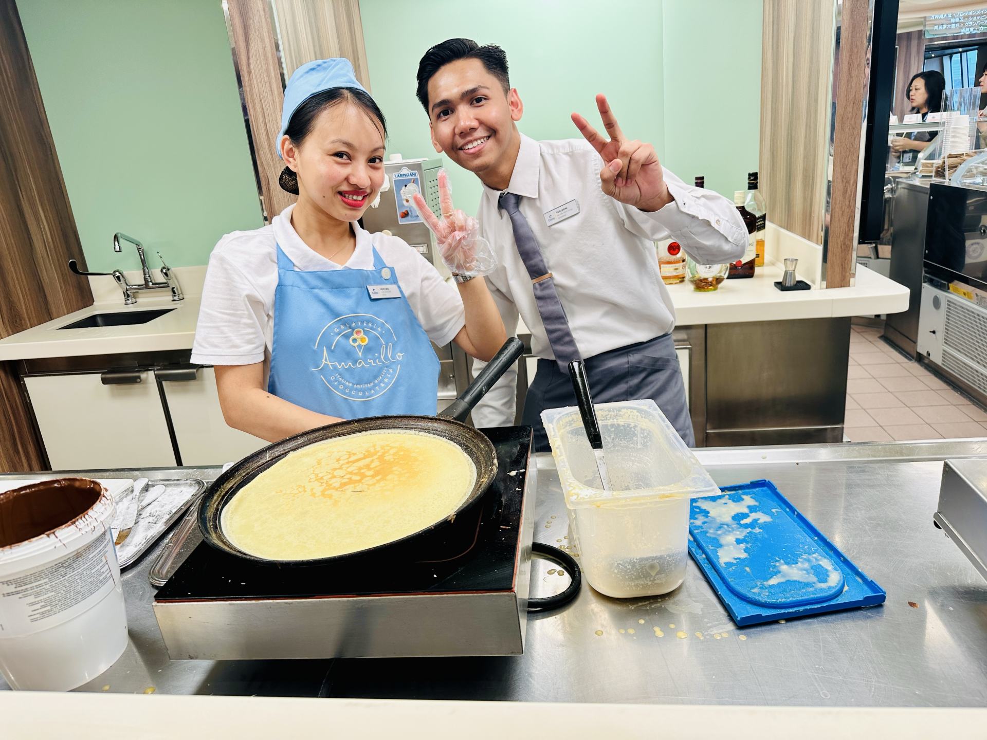 美味しいジェラートとクレープのお店があります。こちらは有料ですが、おいしくておすすめです。明るいスタッフさんはクレープの向こうからVサインを送ってくれました。