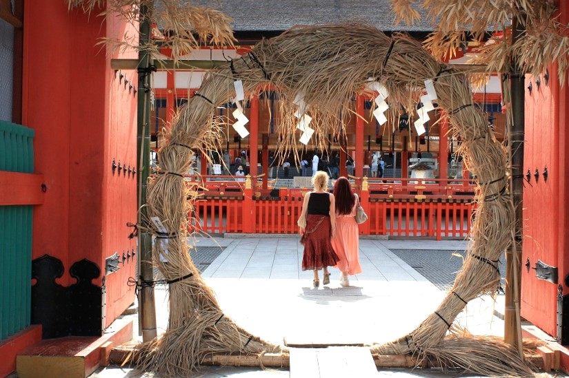 参拝者は「茅の輪」をくぐって厄除けを行い入って行きます。