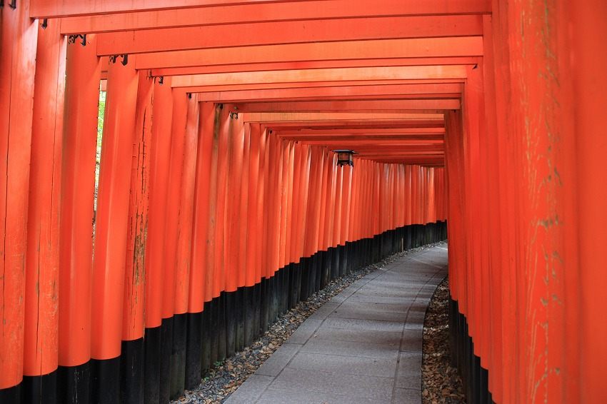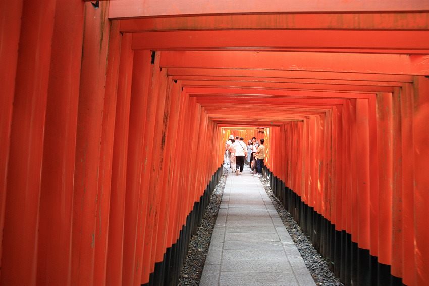 〇赤い鳥居が続く千本鳥居の景色は極めて日本的。