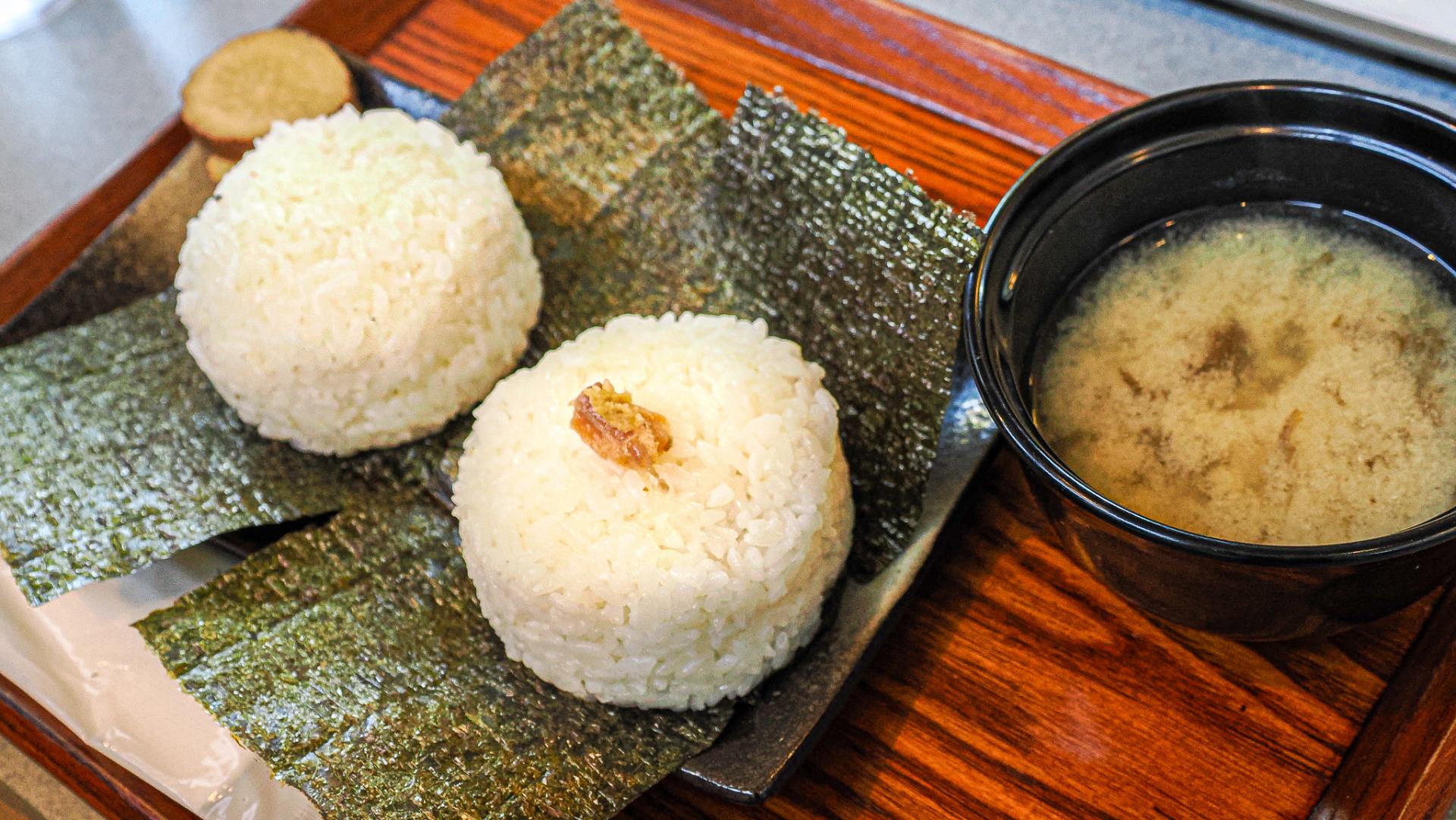 選べるおにぎりが2個と岩のり味噌汁のセットです。