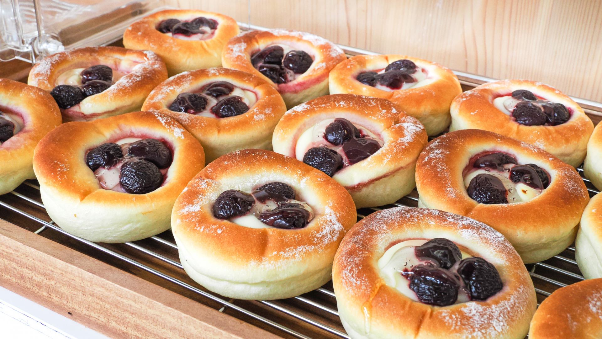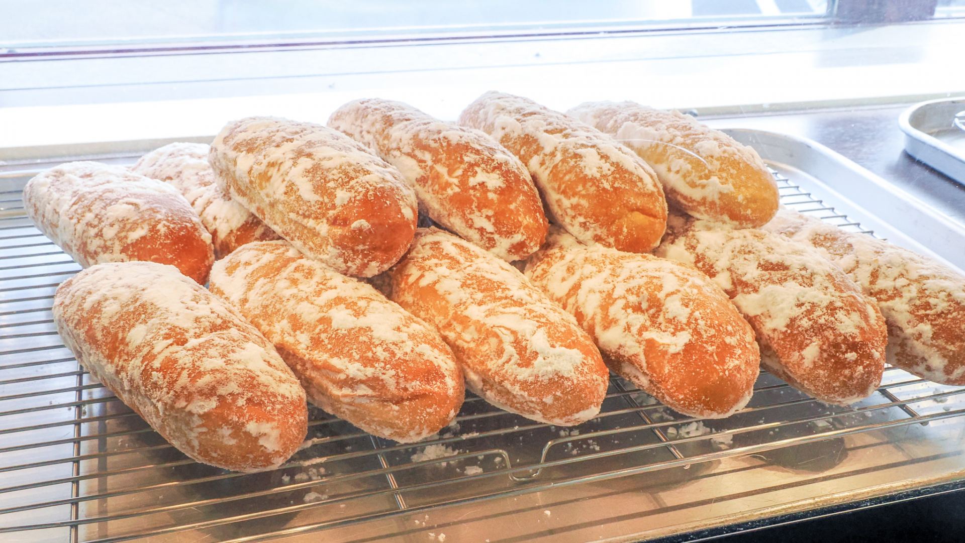 そして店の奥を見ると、オーブンから出たばかりのパンが店頭に並ぶタイミングを棚の上で待っている光景も目に入ります。