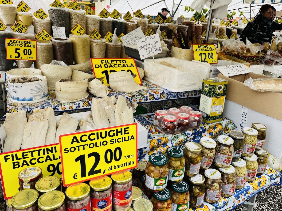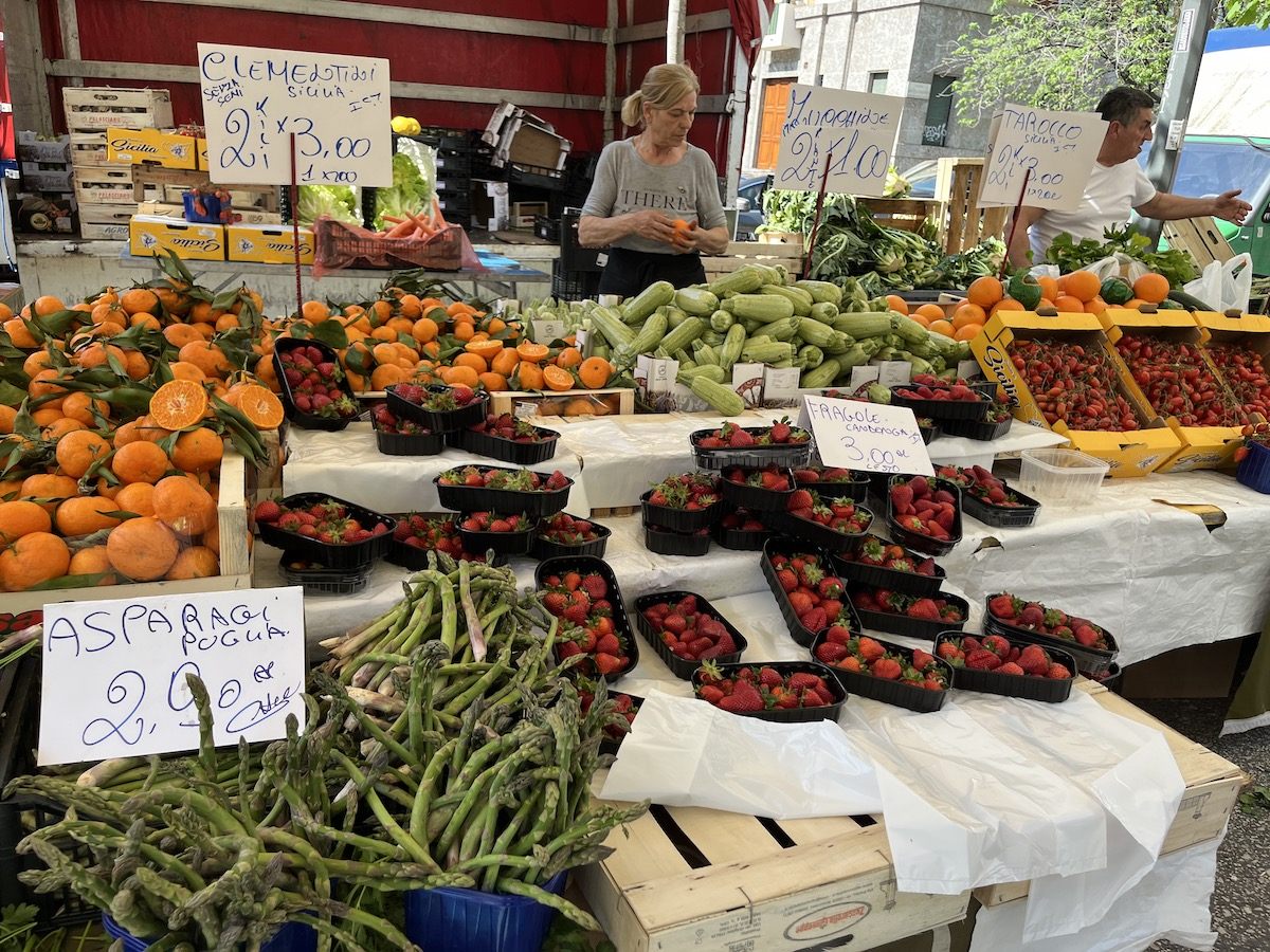 週に2回、火曜日と土曜日に開催。野菜や果物、お肉、ドライトマト、缶詰などの食料品が多く並ぶ品揃い豊富なメルカートです。