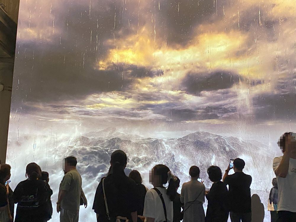 大スクリーンに映し出される迫力ある波しぶきの映像の前で、多くの人が写真を撮っています。