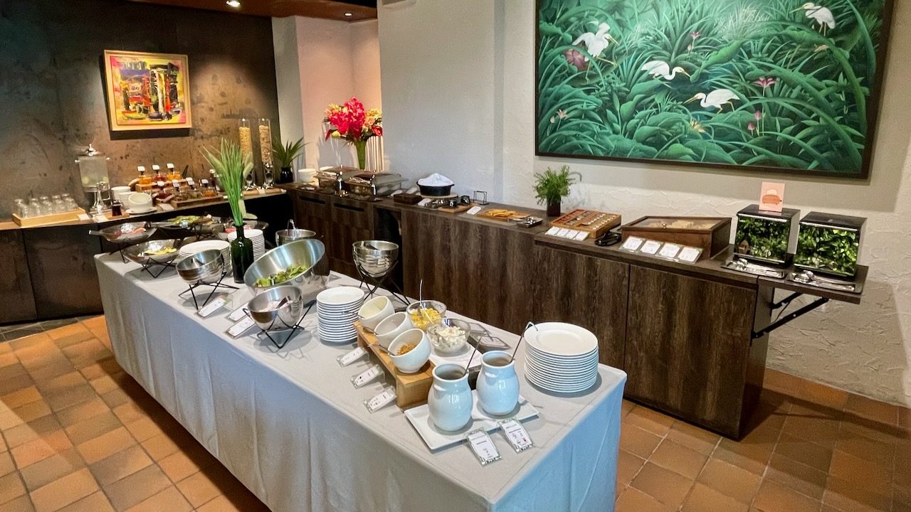 朝ご飯付きでささやかな楽しみ。シリアル、トースト、ぺィストリー、おむすび、卵料理、ハム又はソーセージ、日替わりの焼き魚、グリーンサラダ、フルーツなど。日替わりでフレンチトーストかミニブリトー。着席したらコーヒー、紅茶、各種フレッシュジュース、緑茶など飲み物を聞いてくれます。和洋折衷で、小ぶりのおむすびは自分で海苔を巻いて食べるパリパリ海苔の粋な提供です(2〜3個はいけるサイズ)。