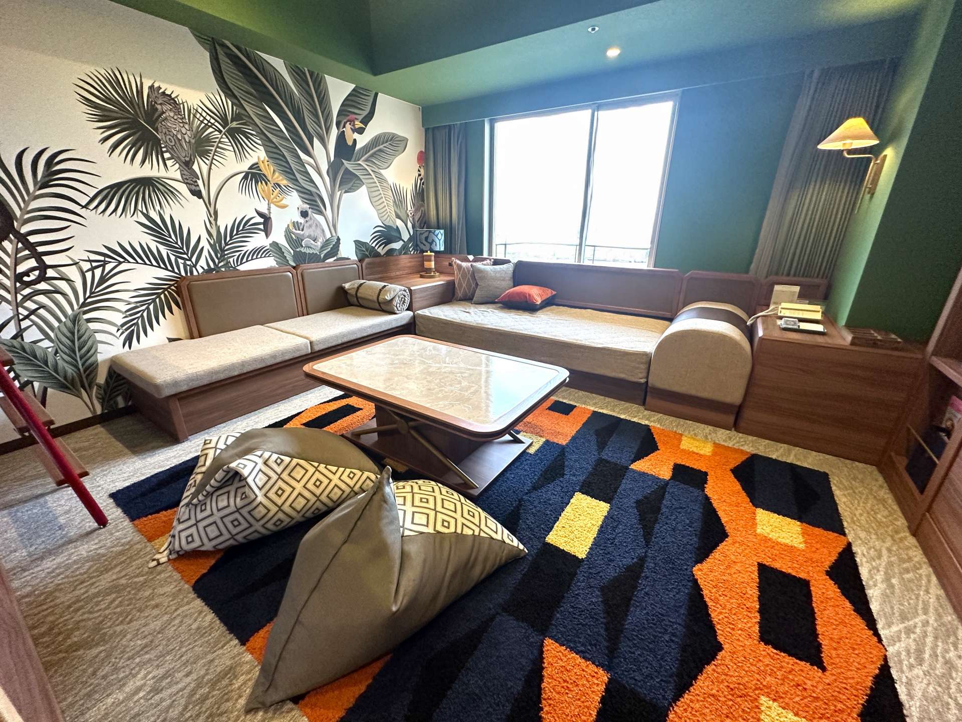 コンセプトは、「家族で船旅中、不思議な島を発見!冒険中に出会った島民に招待され、素敵な小屋で過ごす旅」。靴を脱いで素足で過ごせるお部屋です。
