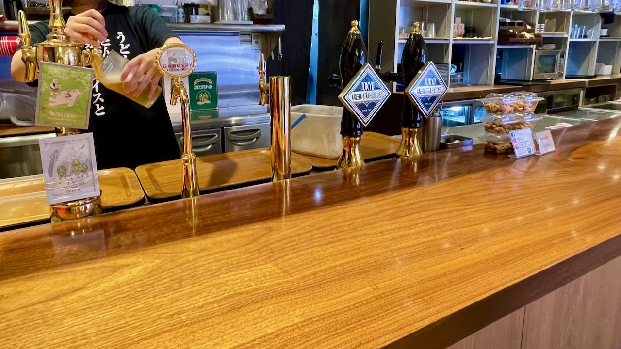 ここはミシュラン東京2015、2016でビブグルマンを獲得し、2017年にパリに引っ越し、今やパリのミシュランでもビブグルマンに選ばれている「手打ちうどん喜心(Kishin)」の梅谷さんから味を受け継いだビアバーダイニングだそうです。かなり混んでいましたが、なんとか隅田川ビールにありつきました。