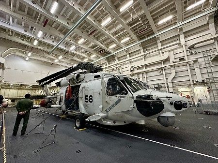 奥には、潜水艦を探知する哨戒ヘリコプターSH-60Kが展示されていました。「護衛艦いずも」は、SH-60J/K哨戒ヘリコプター × 7機、MCH-101輸送ヘリコプター × 2機、最大14機搭載可能です。