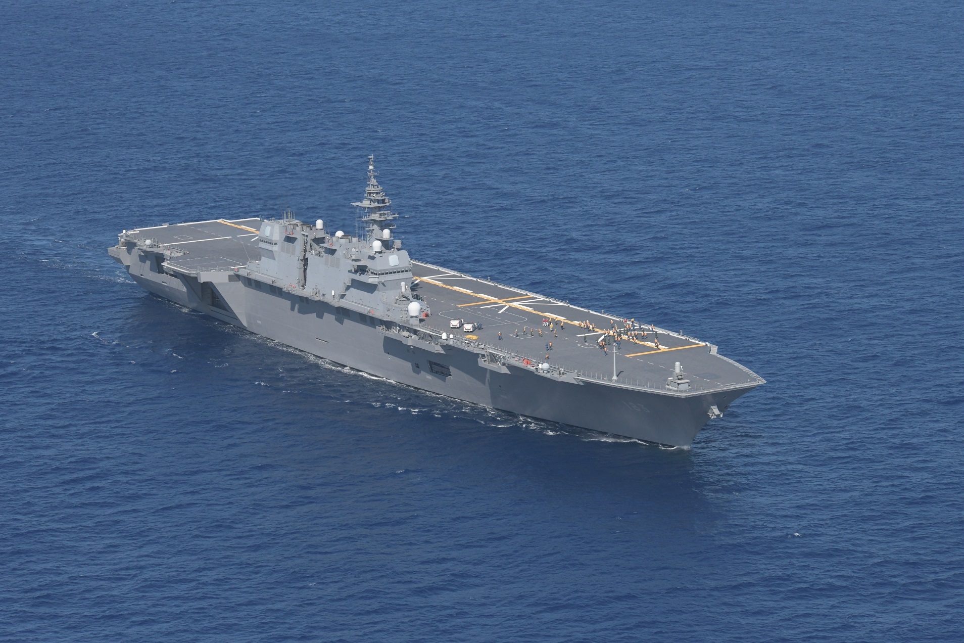 「護衛艦いずも」は、海上自衛隊のヘリコプター搭載護衛艦(DDH)で、基準排水量 19,500t、全長 248.0 m、最大幅38.0m、髙さ49mで、いずも型護衛艦2番艦の「護衛艦かが」(DDH-184)とともに海上自衛隊史上最大の自衛艦です。
