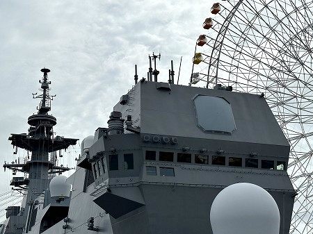 艦橋の反対側です。横並びの窓がある部屋は哨戒ヘリなど航空機の管制室で、飛行長が指揮をとられます。右後方には、天保山の観覧車が見えます。まさに緊張と緩和な光景です。