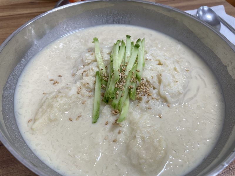 こちらのお店のコングクスはスープがシャーベットのように凍っていて、溶けても味が薄まらず、冷たいまま食べられます。豆そのままの味で淡泊ですが、食欲のないときにはぴったりです。キムチを食べたり、塩を少し加えたりして、味変を楽しむことができます。夏の暑い日にぜひ食べてほしい料理です。