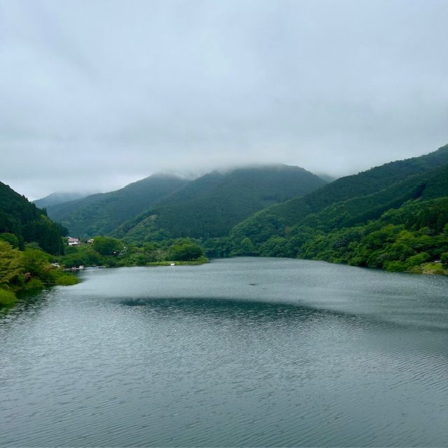山にモヤが掛かった梅田湖の風景