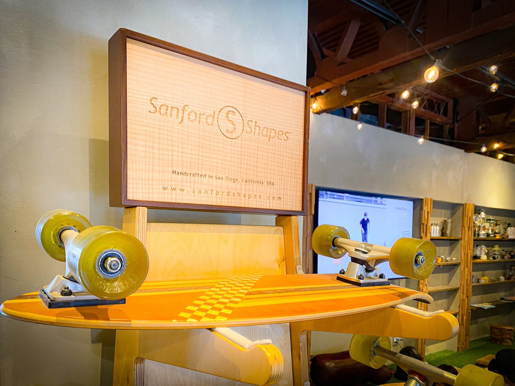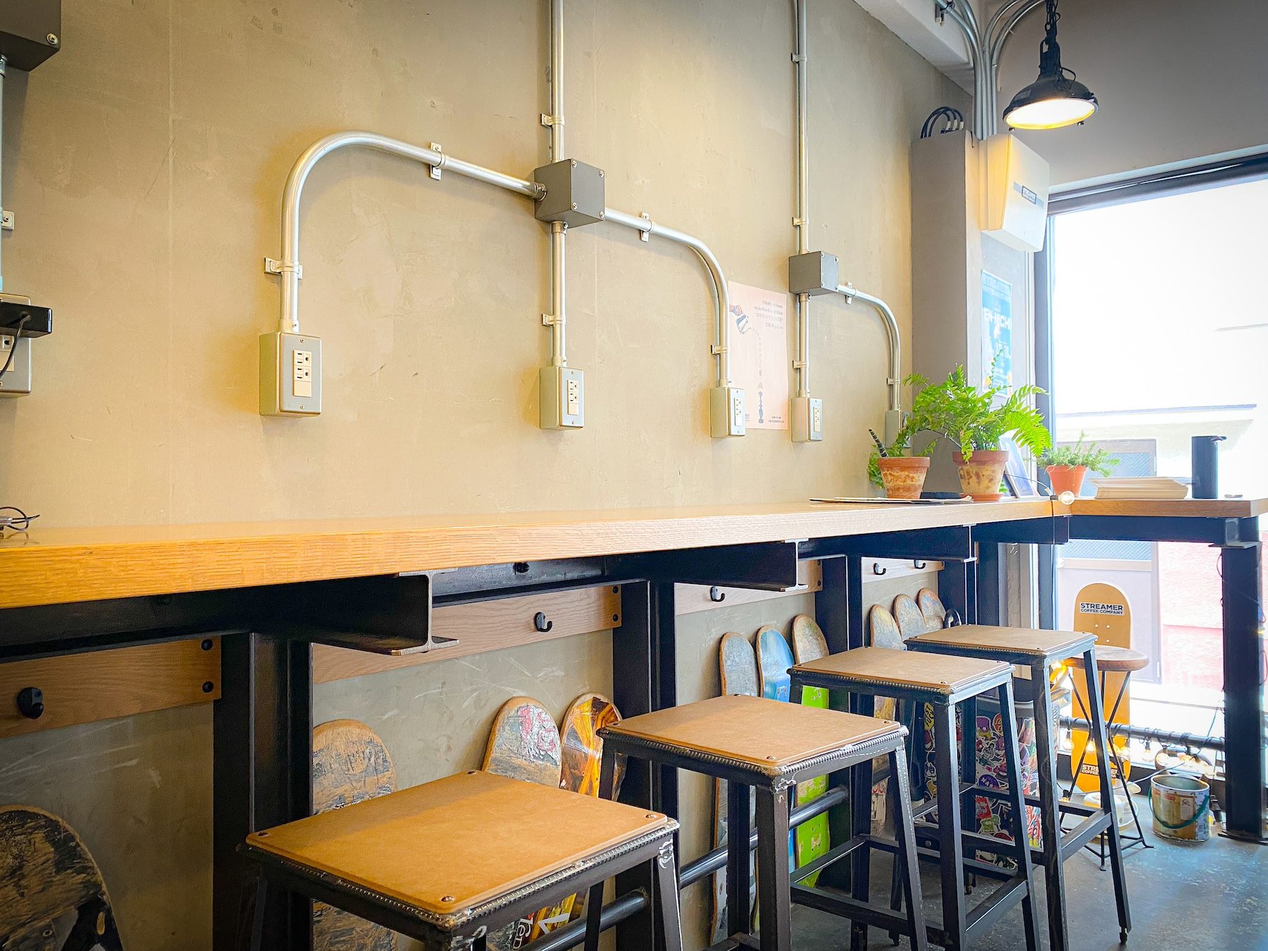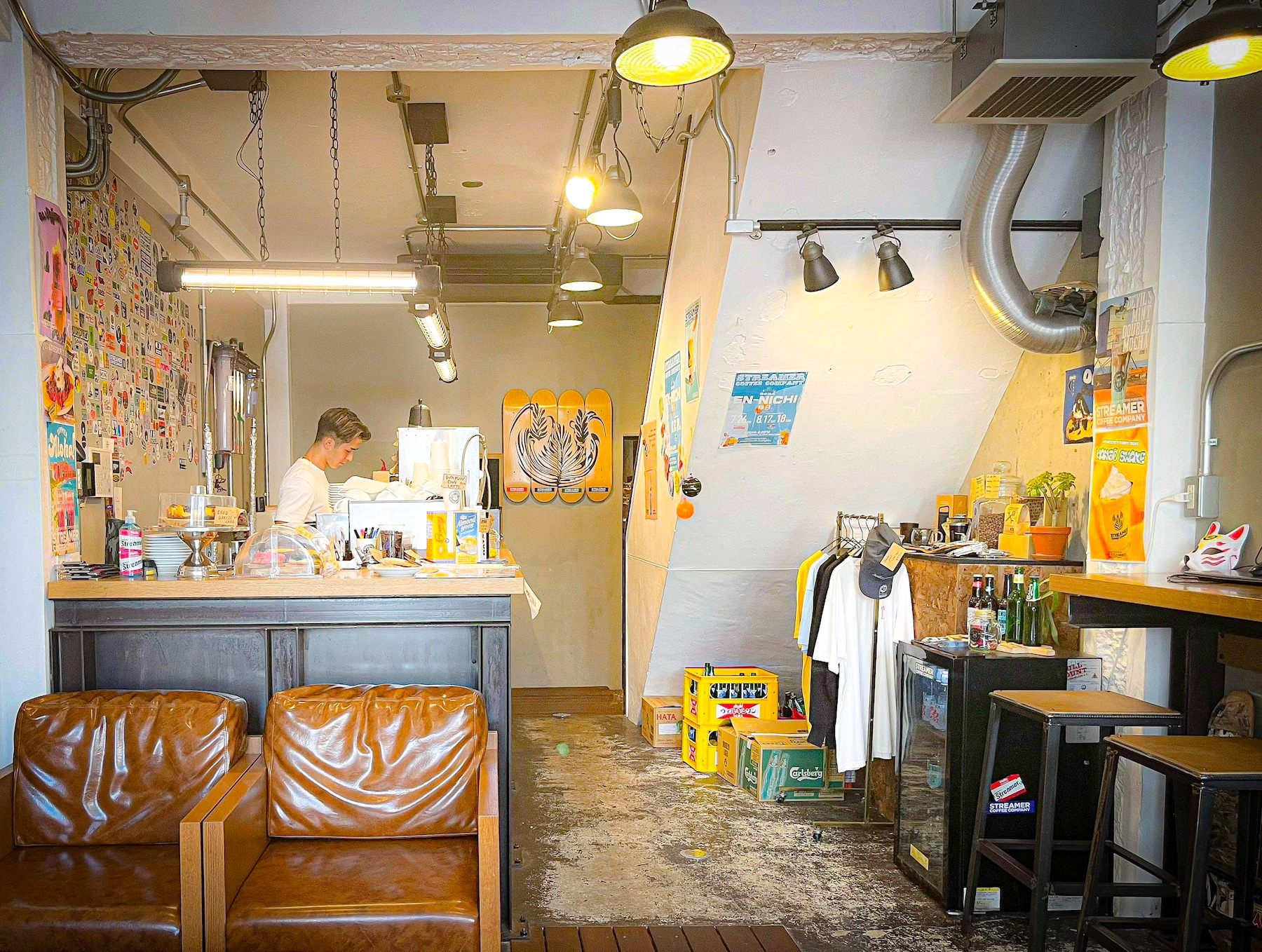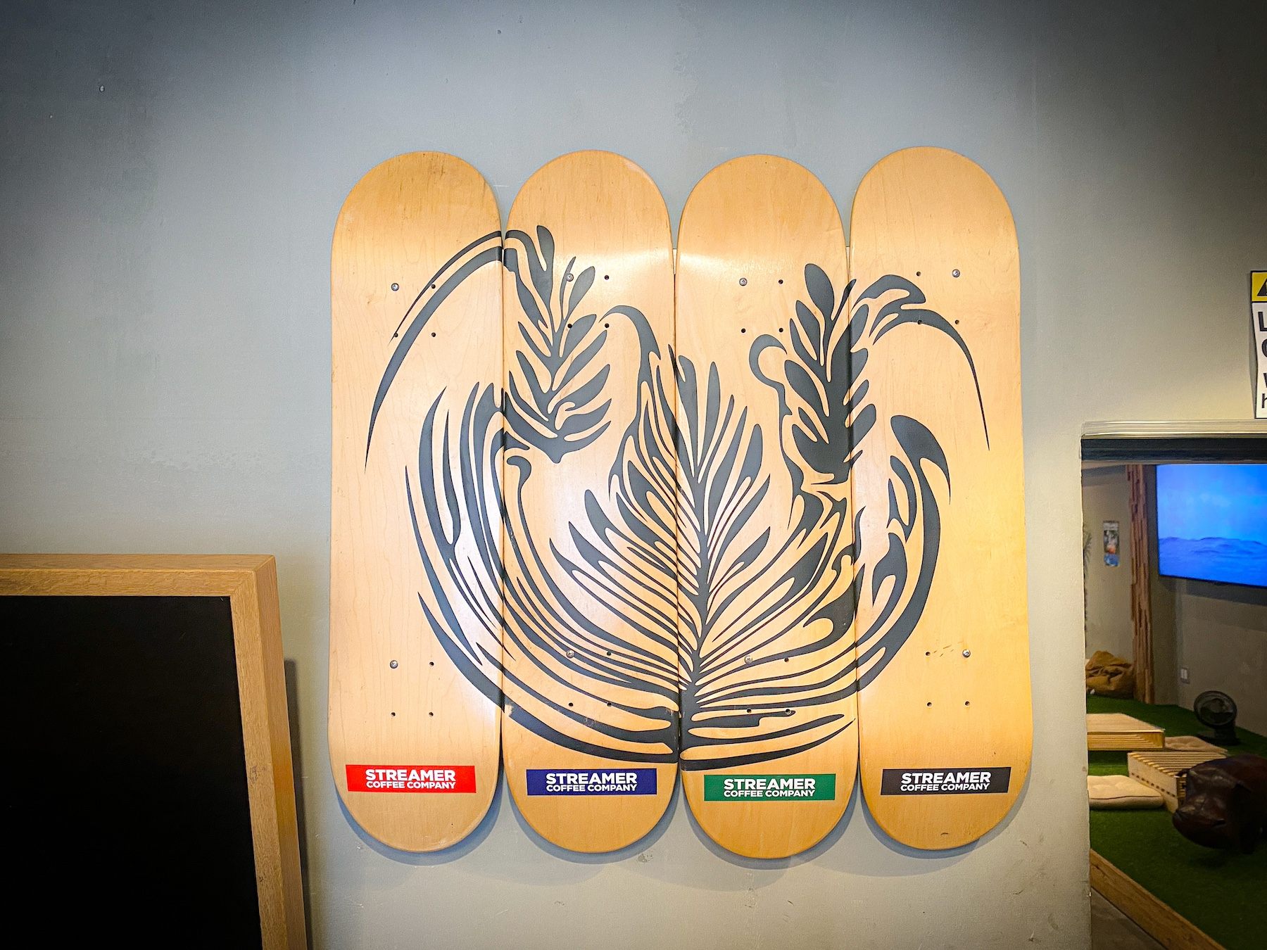 レザーチェアやカウンター席がある入口部分は、もともとは倉庫だったそう。コーヒーカウンターを抜け店舗の奥に進むと、広々とした空間が広がります。こちらはダンスレッスンのスタジオとして使われていたのだとか。倉庫とスタジオをリノベして繋げ、ひとつの店舗にしたというから驚きです。店内にはアメリカ西海岸をベースにした、ストリートインスパイヤの小物が飾られており、スケートボードなどが並んでいました。