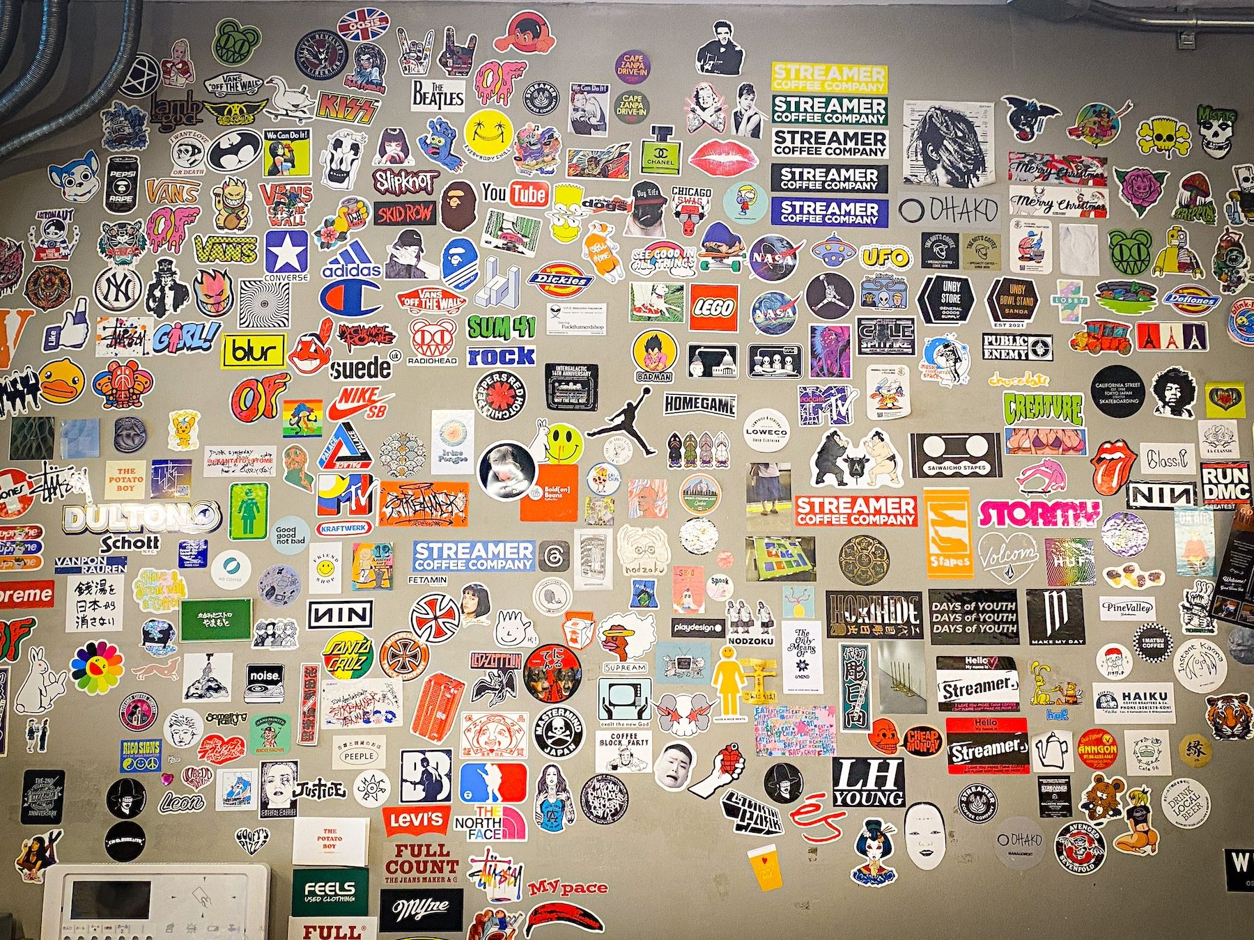 レジ横にはケーキやドーナツなどの軽食が揃います。後ろの壁に、たくさんのステッカーが貼ってあるので、お好みのステッカーを見つけるのも楽しいひととき。