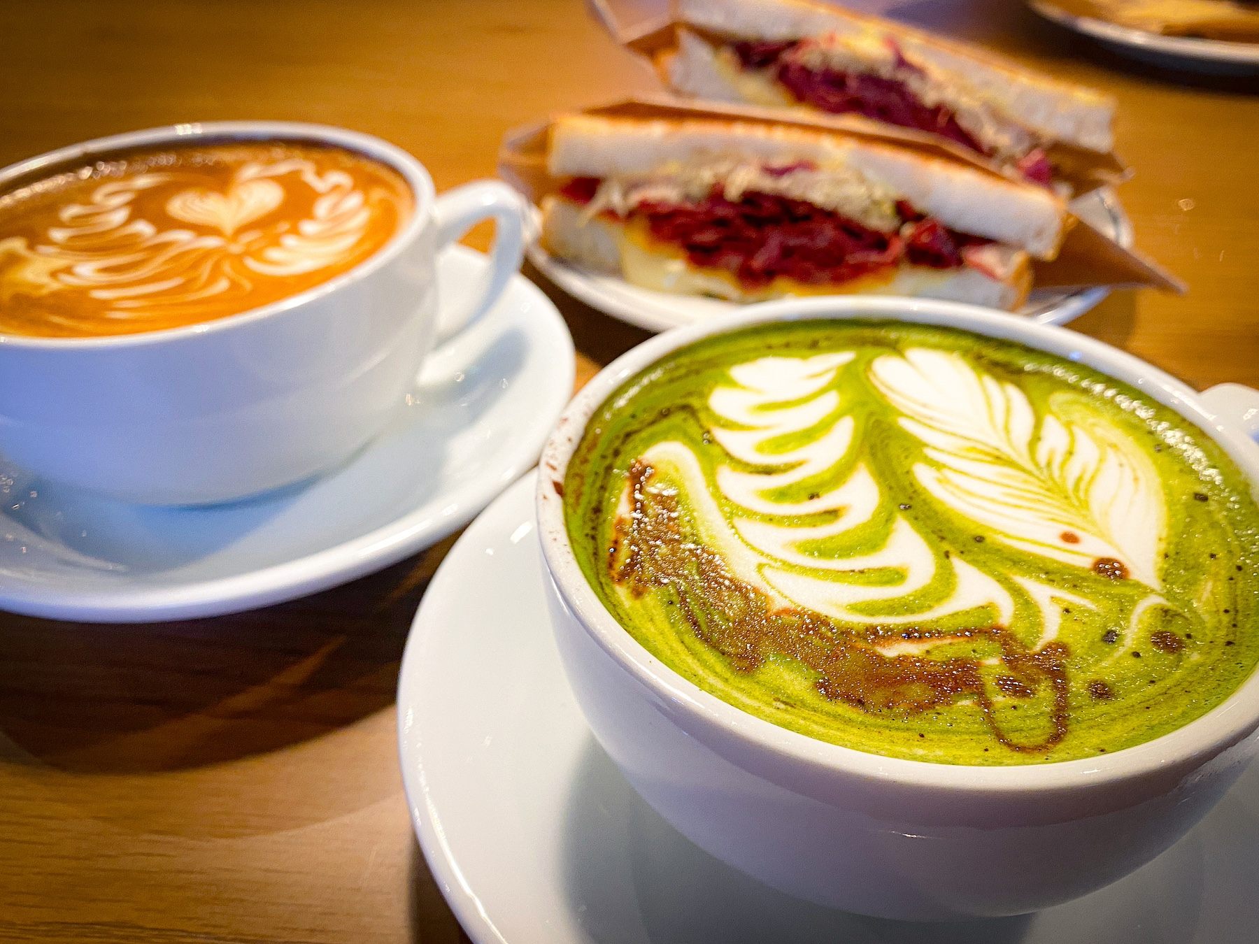 グリーンが美しい「ミリタリーラテ」は抹茶とエスプレッソを合わせた元祖抹茶ラテです。大きめのカップに閉じ込めた、迷彩柄に目を奪われてしまうメニューです。どちらのラテも極上の味わいで、うっとりしてしまいました。